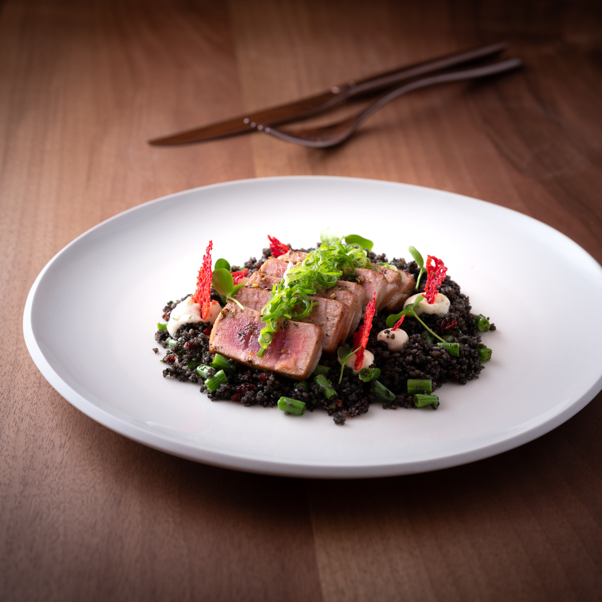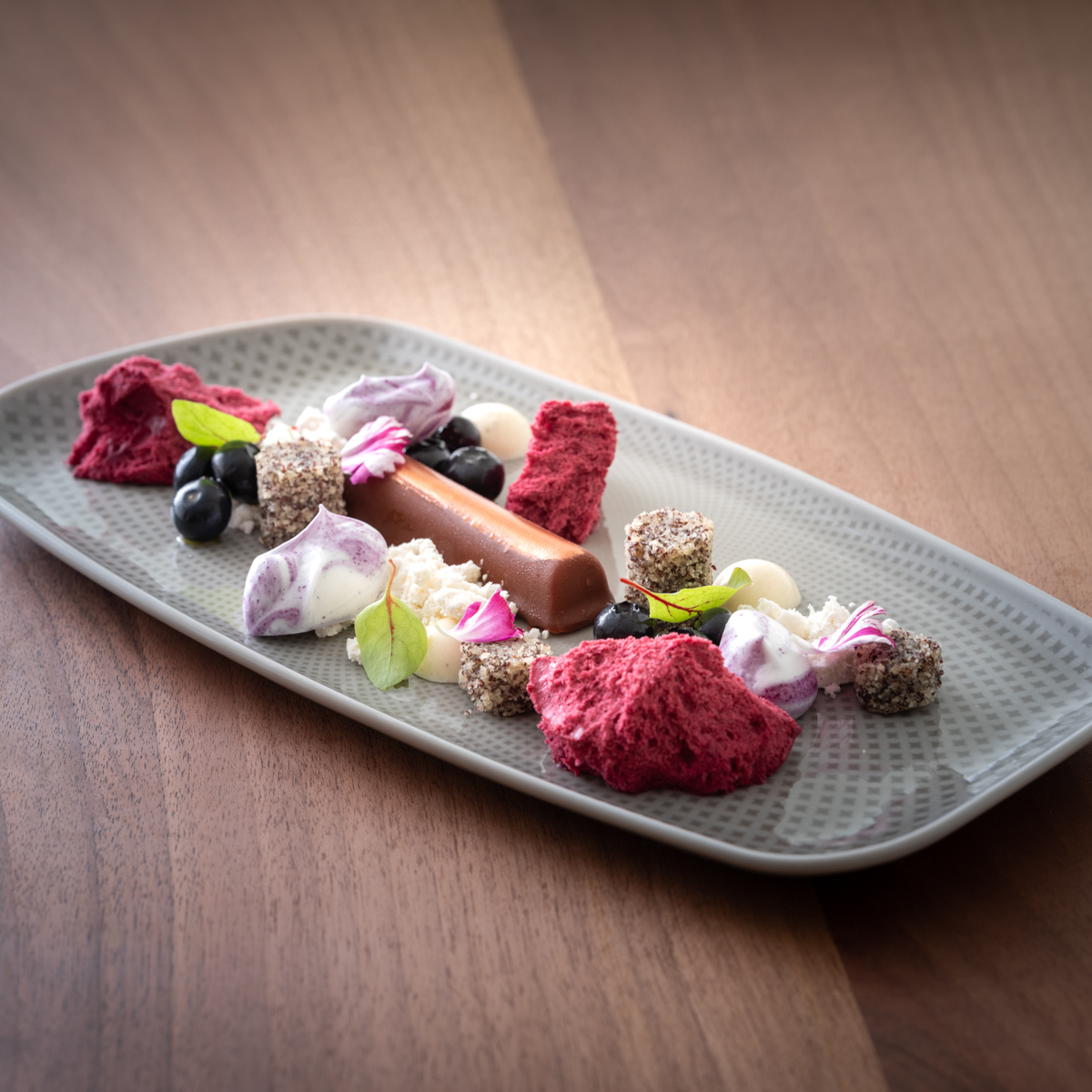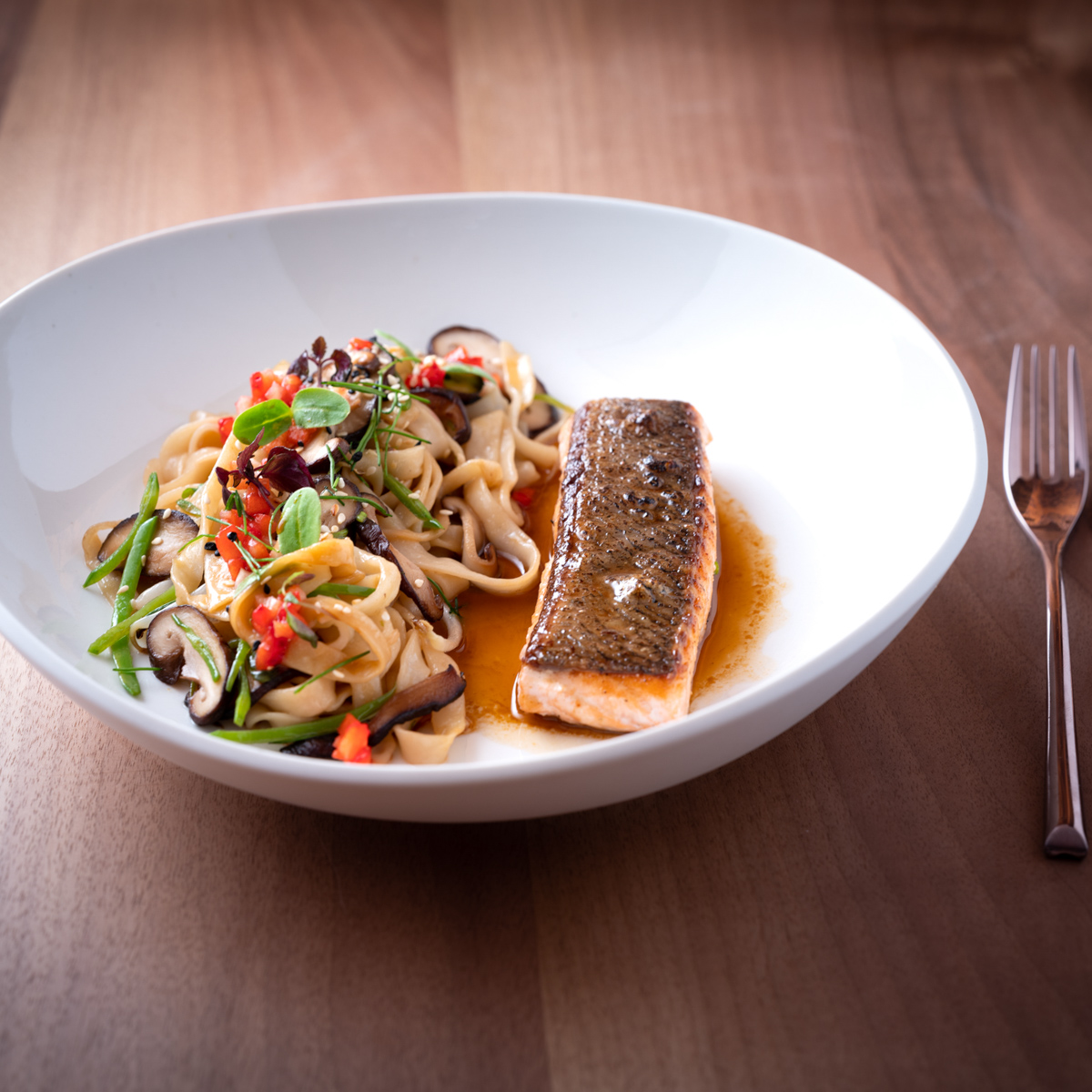 Der Wildlachs mit hausgemachten Udon-Nudeln, Zuckerschoten, Shiitake-Pilzen und Sesam-Yuzu-Marinade ist eine intuitive Gaumenreise nach Asien, auf die man vom vietnamesischen Küchenchef Kiet Phung mitgenommen wird und die auch sonst Ländergrenzen überwindet. Denn auf die Reise geht es auch mit Vedad Hadziabdic in sein bevorzugtes Weinrefugium Italien sowie in das Champagner-Land Frankreich.