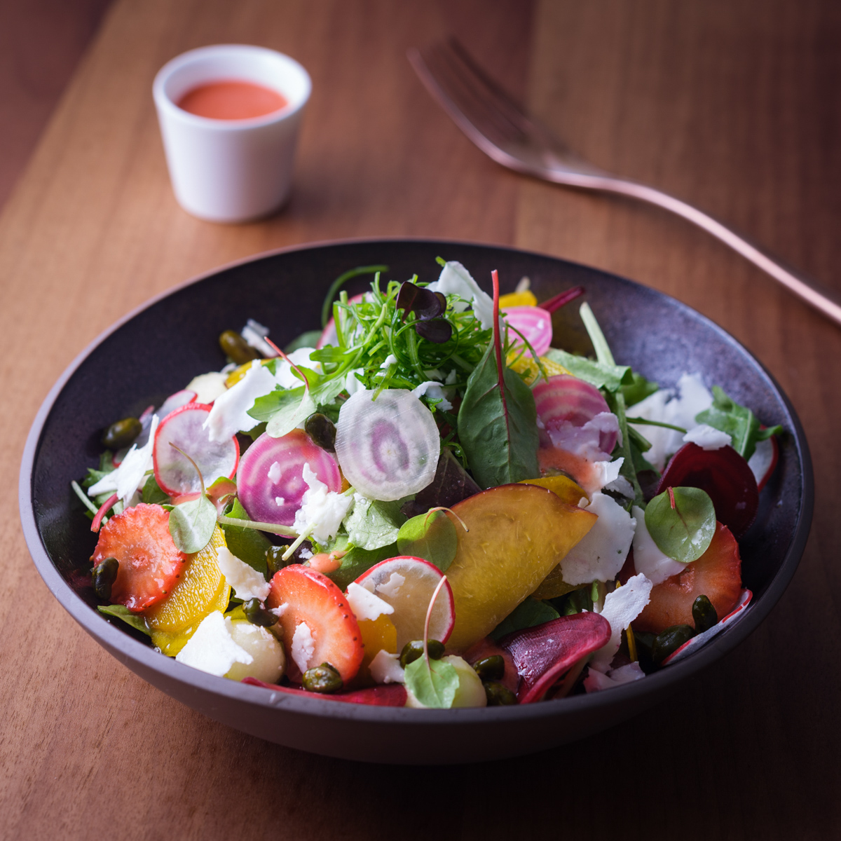 Ein halbes Dutzend Gerichte, darunter violette Süßkartoffel-Kroketten mit Gurken-Karotten-Salat, Sojasprossen, Sesam-Dressing und Cashew-Dill- Mayo sowie eine samtige Sellerie-Cremesuppe mit säuerlichem Granny Smith Apfel, Petersilienöl und hausgebackenem Brioche. Die eigene Backstube ist eine feine Sache, doch Qualität einzukaufen, ist ebenfalls zulässig.