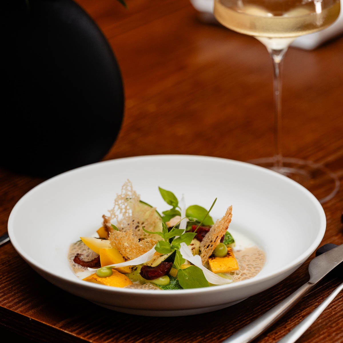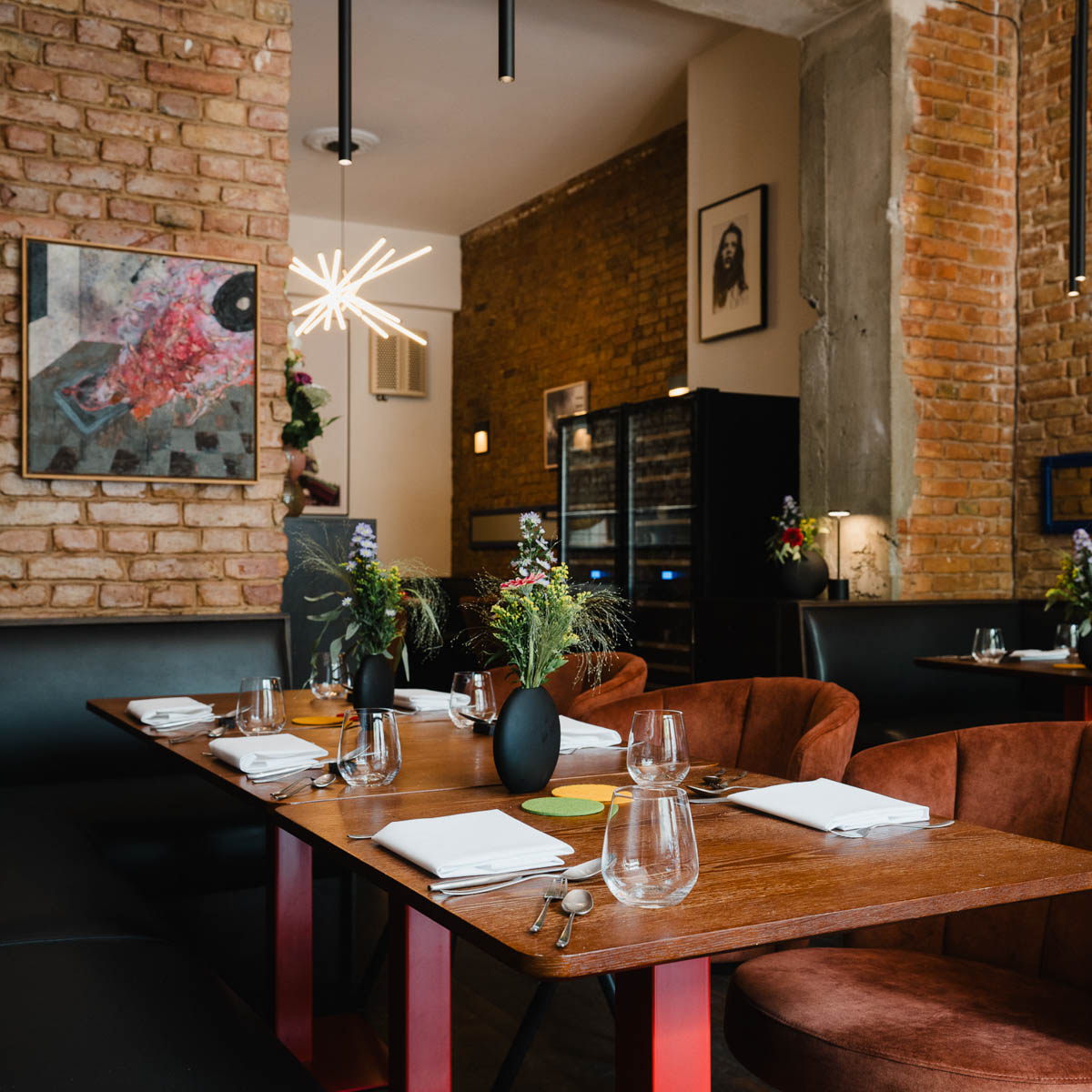 Die sommerliche Bestuhlung vor dem Restaurant Brikz in der Grolmannstraße in Charlottenburg leuchtet rot unter einer kräftig blauen Markise. Drinnen ist es schummrig zwischen den namensgebenden Backsteinwänden. Ende 2020 eröffnete Arne Anker – laut Rolling Pin die Nummer 55 der 100 bestens Chefs Deutschlands – sein erstes eigenes Restaurant. Seine detailverliebte, saisonale Küche und der unkomplizierte Service garantieren einen großartigen Abend.