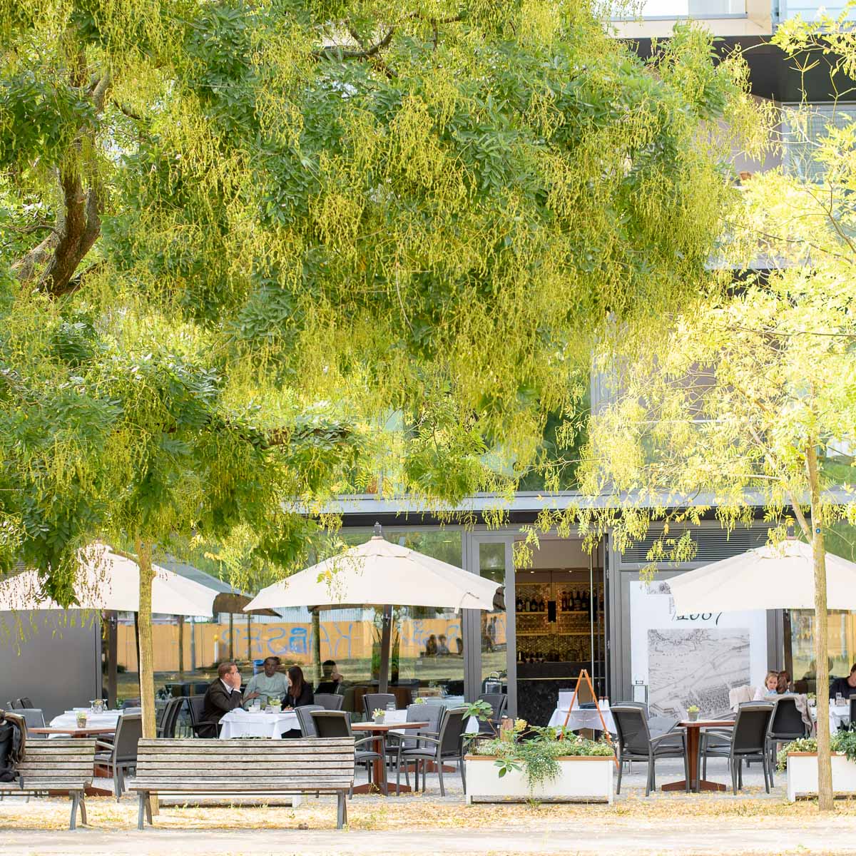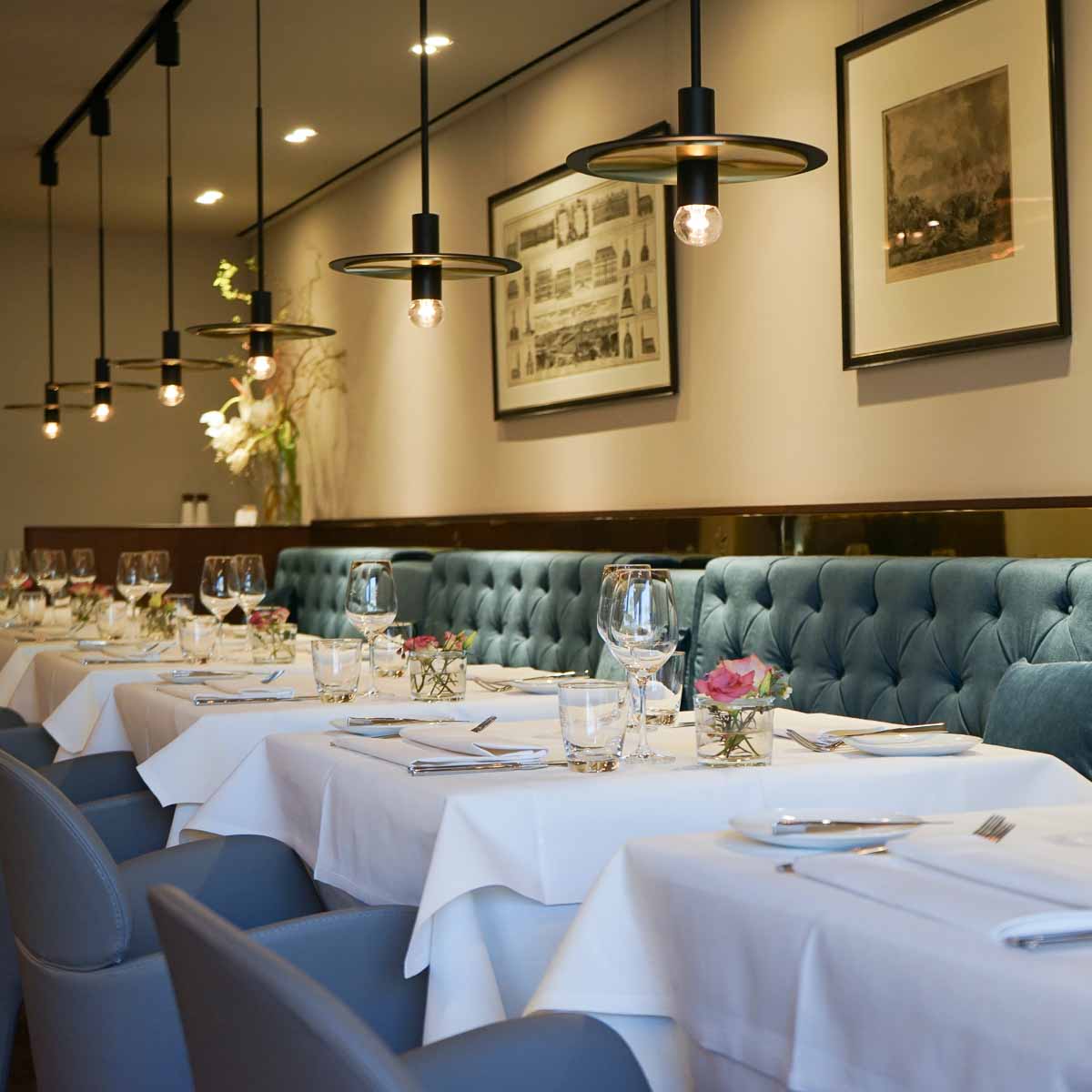 Eine lange Glasfront lässt das Restaurant samt Café mit dem Stadtplatz verschmelzen. Innen schaffen Nuancen von Beige, Braun und Gold bis Grün und Petrol – letztere kommen auf den langen Samtbänken besondert gut zur Geltung – eine Beziehung zum Platz. Das von einem Italiener erdachte Interieur ist dabei klassisch und gleichermaßen cosy. Dazu trägt auch der Boden bei. Er wurde aus Eichenholz einer 300 Jahre alten Scheune gefertigt.