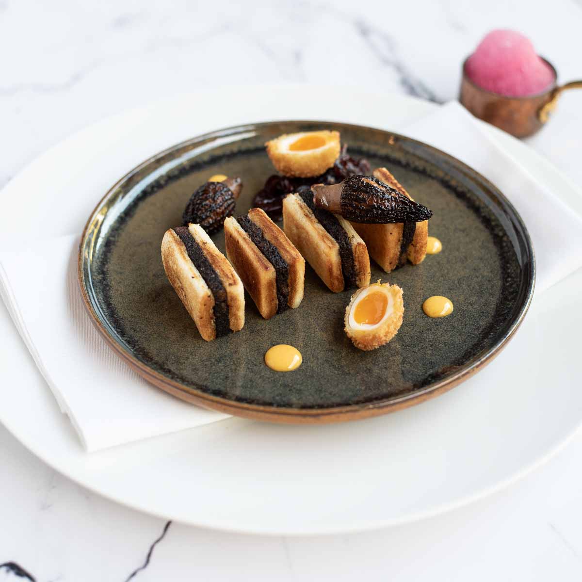 Apropos Pflanzenglück. Schneidet man die rot gefäbte, perfekt texturierte Ravioli an, fließen Schafskäse und Eigelb sanft hinaus. Ein Biss durch Kürbiskerne, Kräuterpower durch Basilikum, auch diese Vorspeise beweist, wie klassische Küche heutzutage funktioniert, wenn man mit tollen Produkten arbeitet, sein Handwerk versteht und kreativ ist.