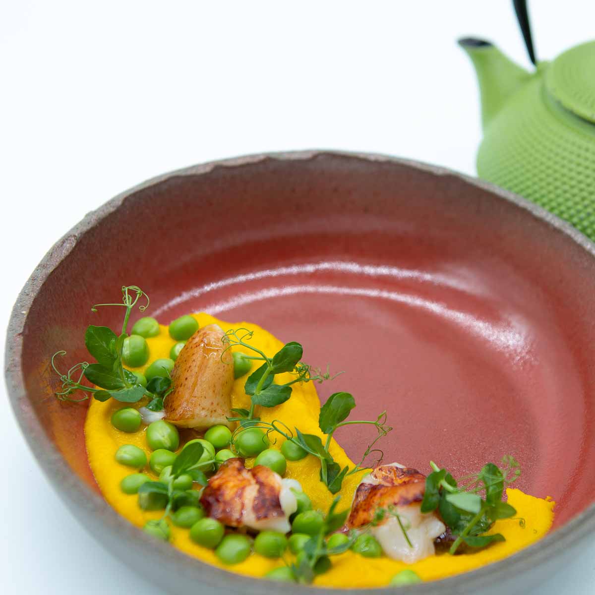 Seine Liebe gehört den Beilagen und so spielt das Gemüse zu Fleisch und Fisch immer eine gleichberechtigte Hauptrolle. Bei Vorspeisen wie "Label Rouge Lachs" oder "Leipziger Allerlei" mit Hummer ebenso wie bei Hauptgerichten, wie dem gedämpften Kabeljau, bei dem uns die freie Interpretation eines Kimchis mit Shitake Pilzen und Koriander sehr gefällt. Ganz hervorragend ist der Caesar Salad, bei dem uns insbesondere das ungewöhnlich leichte, aber dennoch klassisch anmutende Dressing begeistert.