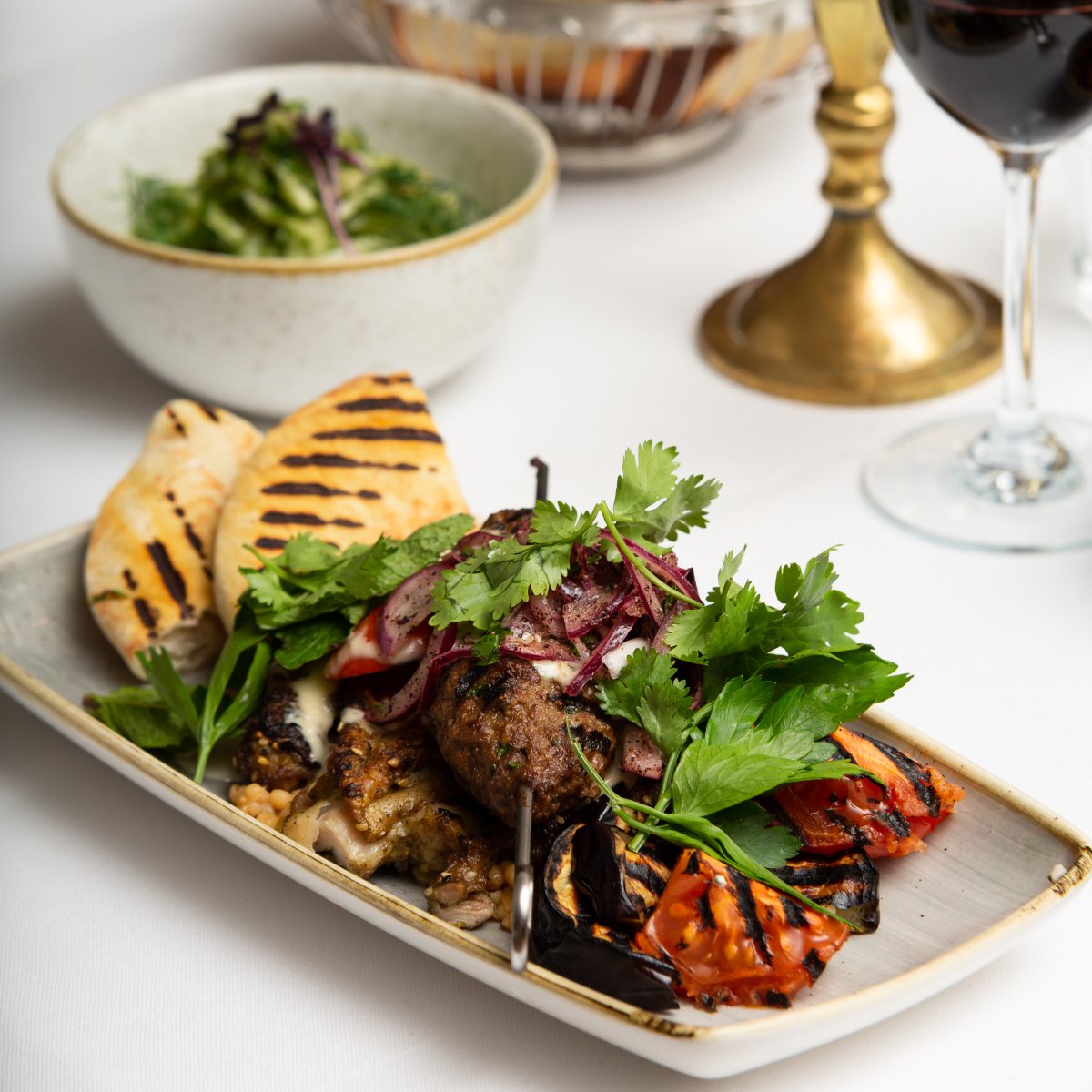Beim Betreten des Ladens sind wir erst einmal überrascht: So viel klassische Eleganz hätten wir bei der Ausrichtung der Küche nicht erwartet. Das Interieur wirkt bis ins letzte Eck durchdacht und etwas aus der Zeit gefallen, ohne dabei jedoch überladen zu wirken oder fürs Auge anstrengend zu werden. Zudem strahlt es eine Wärme und Gemütlichkeit aus, die dann doch wieder einen erstaunlich runden Bogen zur Küche des östlichen Mittelmeers schlägt.