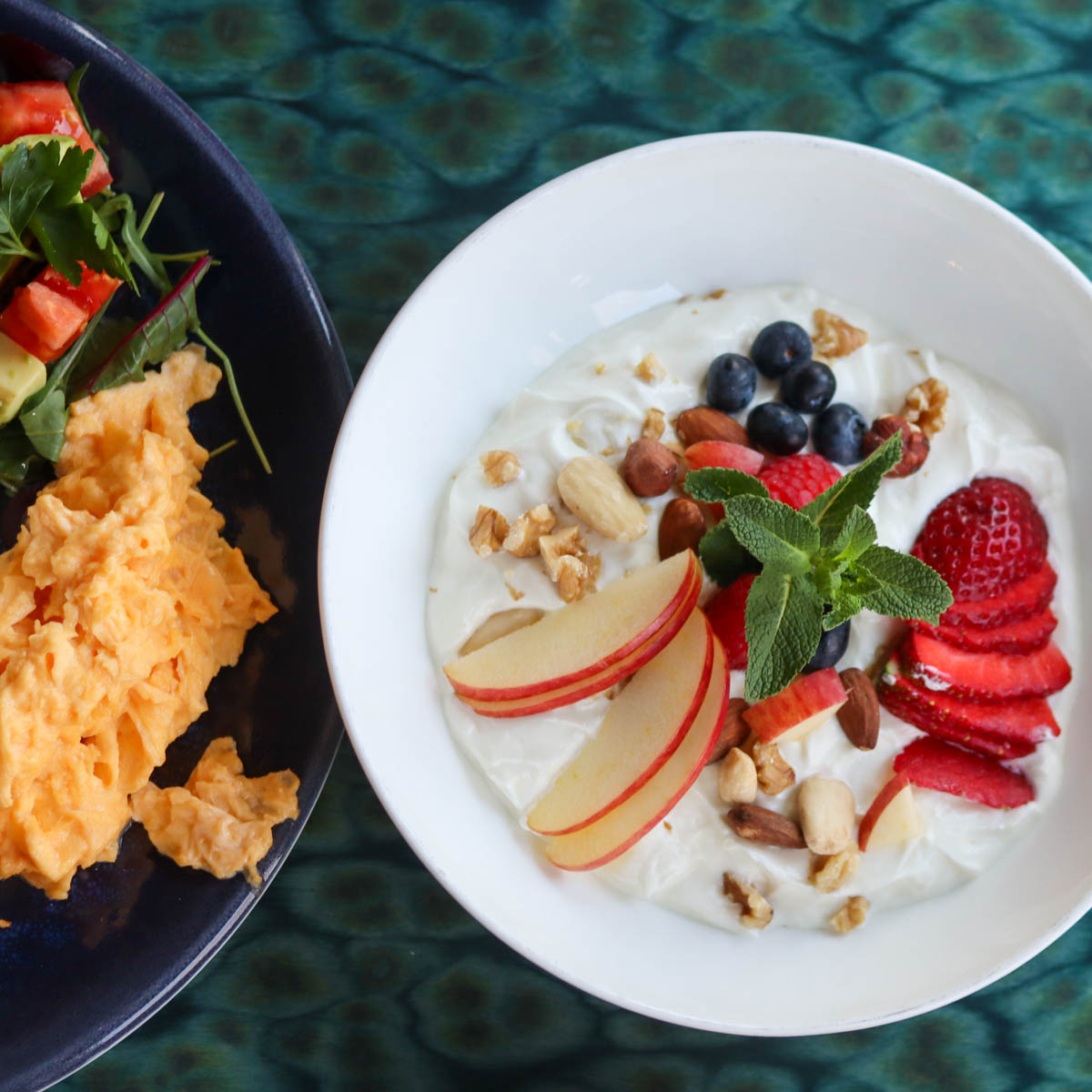 Die Frühstückskarte ist aufgeräumt und setzt auf Klassiker. Zu viert kosten wir uns durch einen Joghurt-Sahne-Quark mit Obst und Nüssen, ein üppiges Kräuterrührei mit krossem Bacon, zwei Stullen mit Rührei – eine davon mit Lachs und eine mit Avocado – sowie „Pauls Frühstück“ – einen üppig gefüllten Frühstücksteller mit Hähnchen-Saté, Hummus, gebackenem Camembert, Rührei mit Bacon, Salami, Landschinken, Käse, Rindertatar und Kaiserschmarrn.