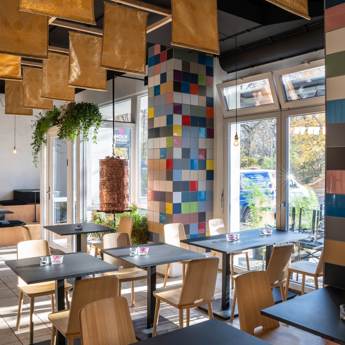 Traditionell und unverfälscht sind auch die Sitzkissen, auf denen man zum Essen gemütlich im Schneidersitz Platz nimmt. Um das zu ermöglichen, wurde im Holy Everest extra ein Podest in dem ansonsten dezent eingerichteten Raum errichtet. Wem das Sitzen am Boden weniger gemütlich erscheint, kann selbstverständlich auch an Tischen sitzen, um zufrieden von luftigen Höhen und Felswänden zu träumen.