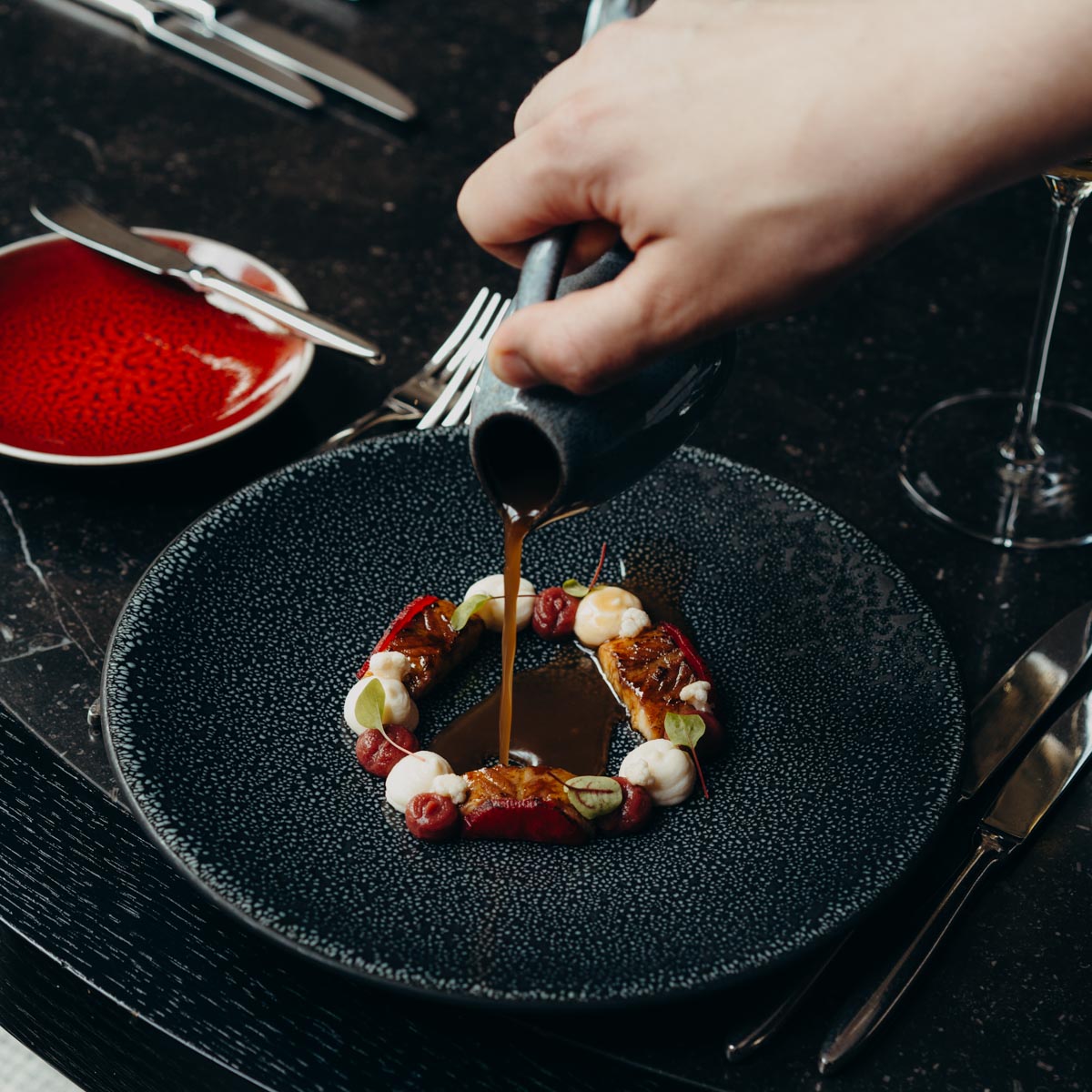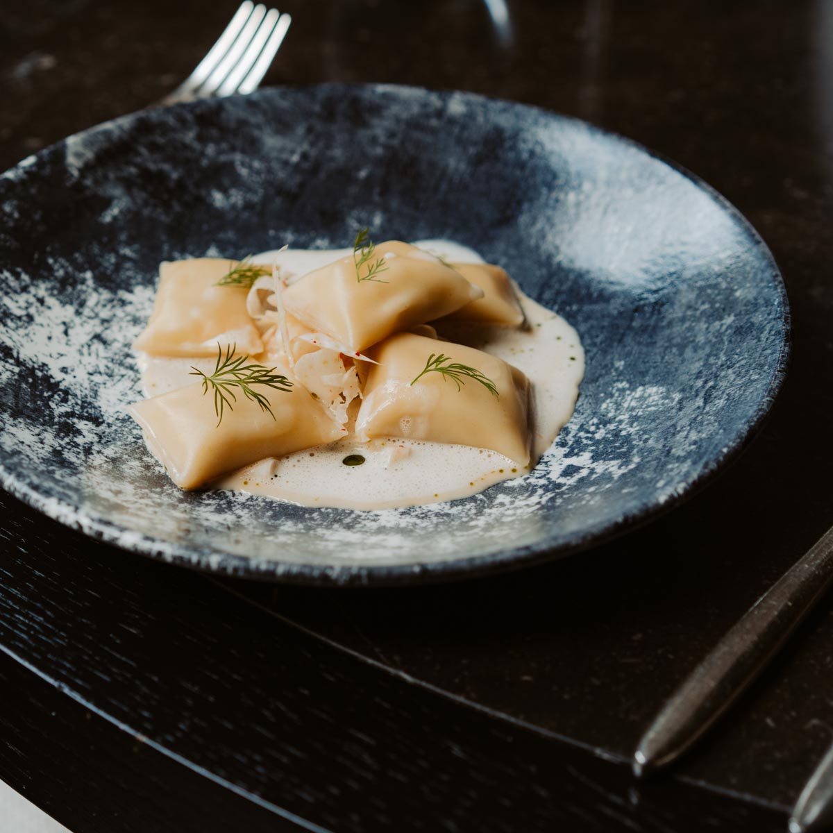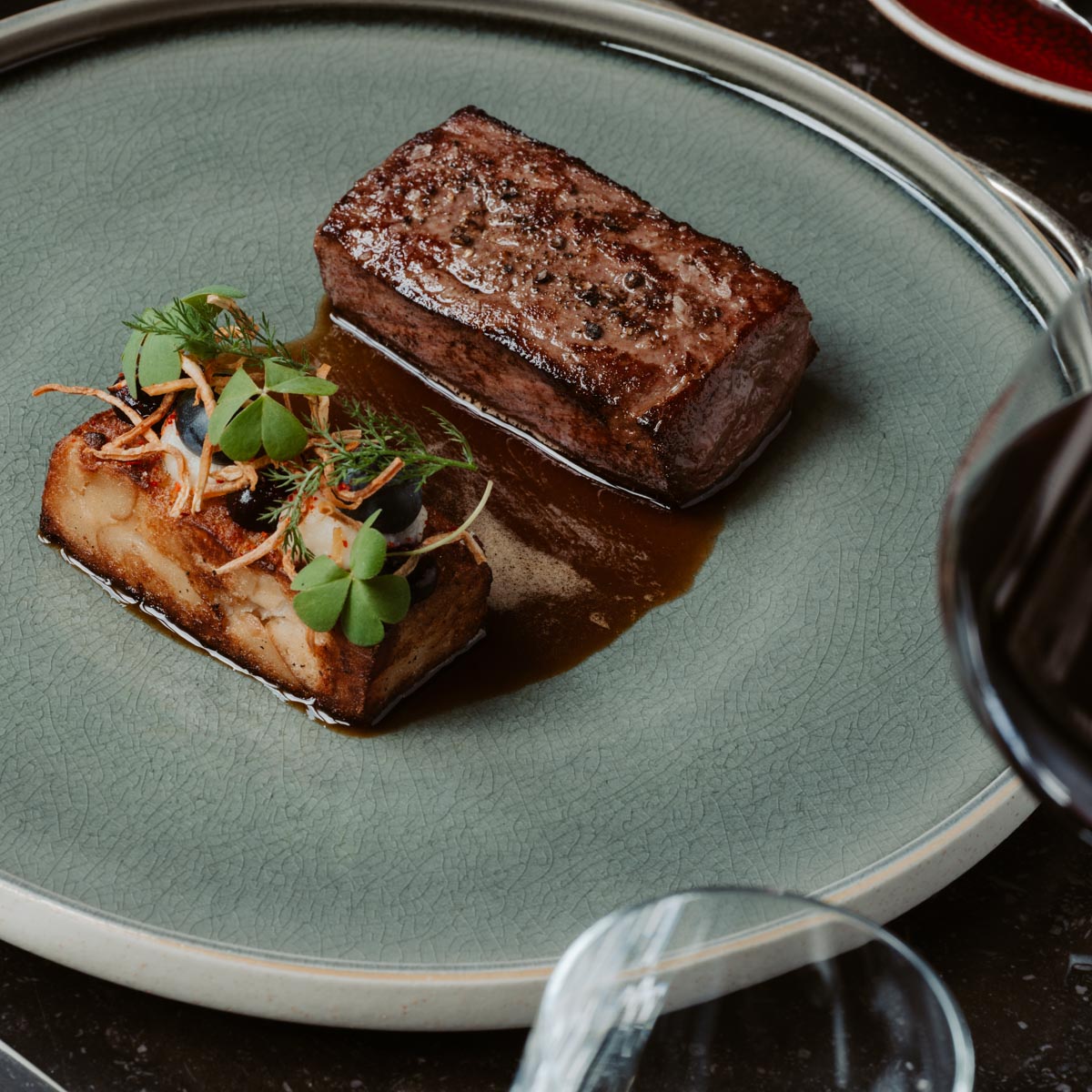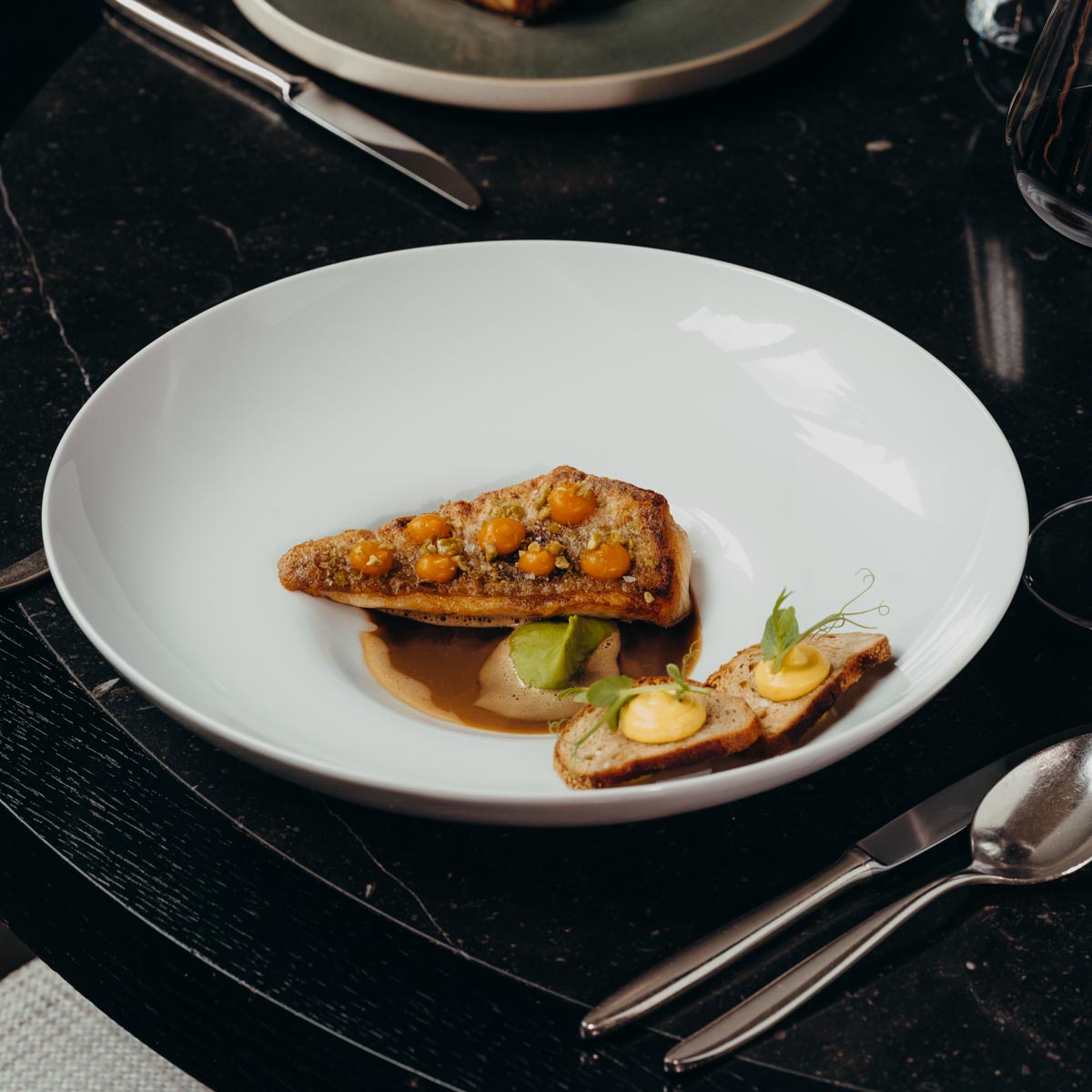 Das Restaurant strahlt Eleganz aus, die nicht nur der französischen Küche gerecht wird, sondern auch der Lage. Die üppigen roségoldenen Leuchter sind sicherlich das Erste, was einem im Restaurant Le Faubourg ins Auge fällt, dazu bodentiefe Fenster, gemütliche Sitzecken, geschmackvoller Soul. Kurz: eine Atmosphäre, in der man sich direkt wohlfühlt, nicht so wie bei Freunden, eher wie ein umgarnter Hollywood-Star in seinem stilvollen Stammlokal.