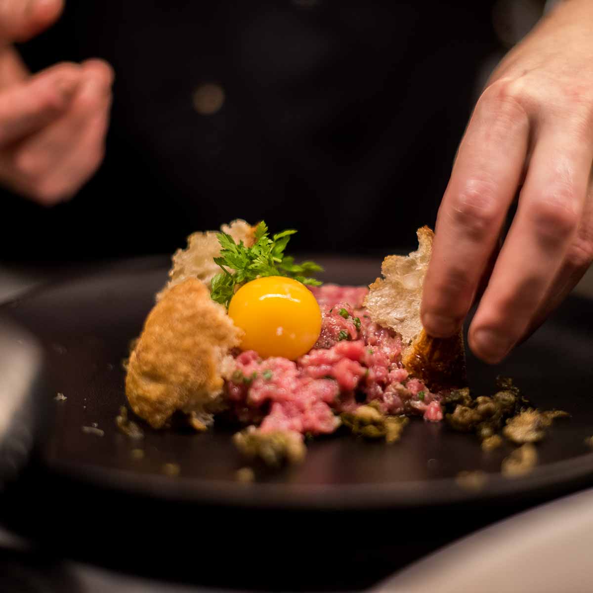 Der aktuellen vegetarischen und veganen Bewegung zum Trotz steht in der Speisewirtschaft das Fleisch im Mittelpunkt – und das ganz bewusst. Denn das hoch qualitative Fleisch für Dry-Aged-Burger, Tatar und Co. stammt aus der eigenen Schlachterei Kumpel & Keule, in der ein direkter Kontakt zu den Landwirten und Produzenten aus der Region gepflegt wird, um das Wohl der Tiere zu gewährleisten. Ganz nach dem Motto "Nur der Metzger, der die Tiere liebt, ist ein guter Metzger".