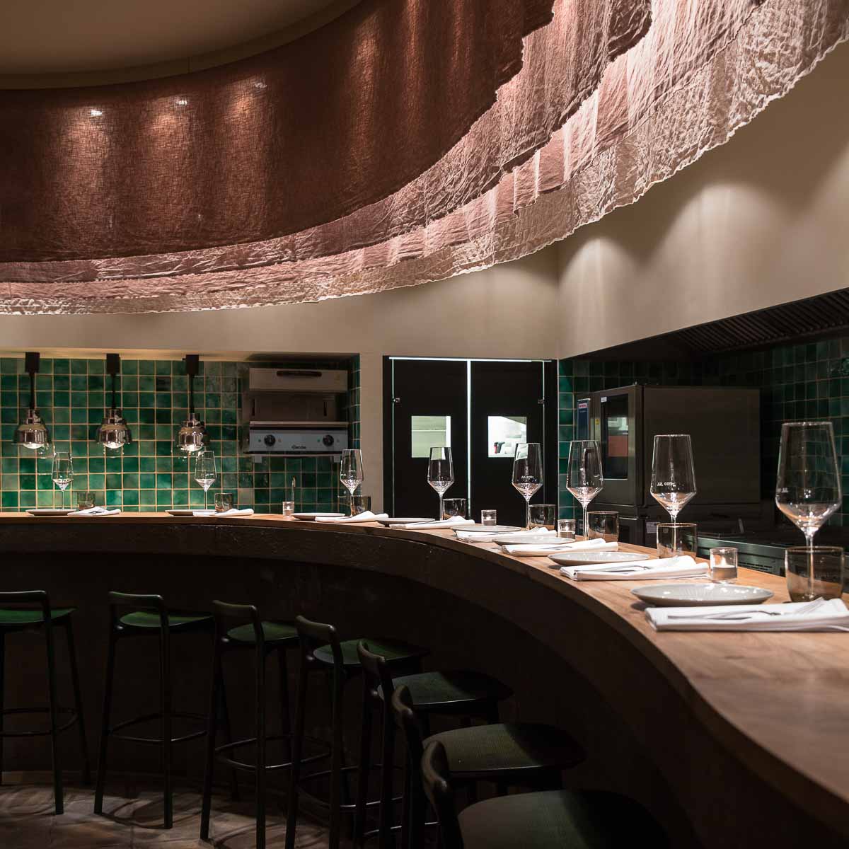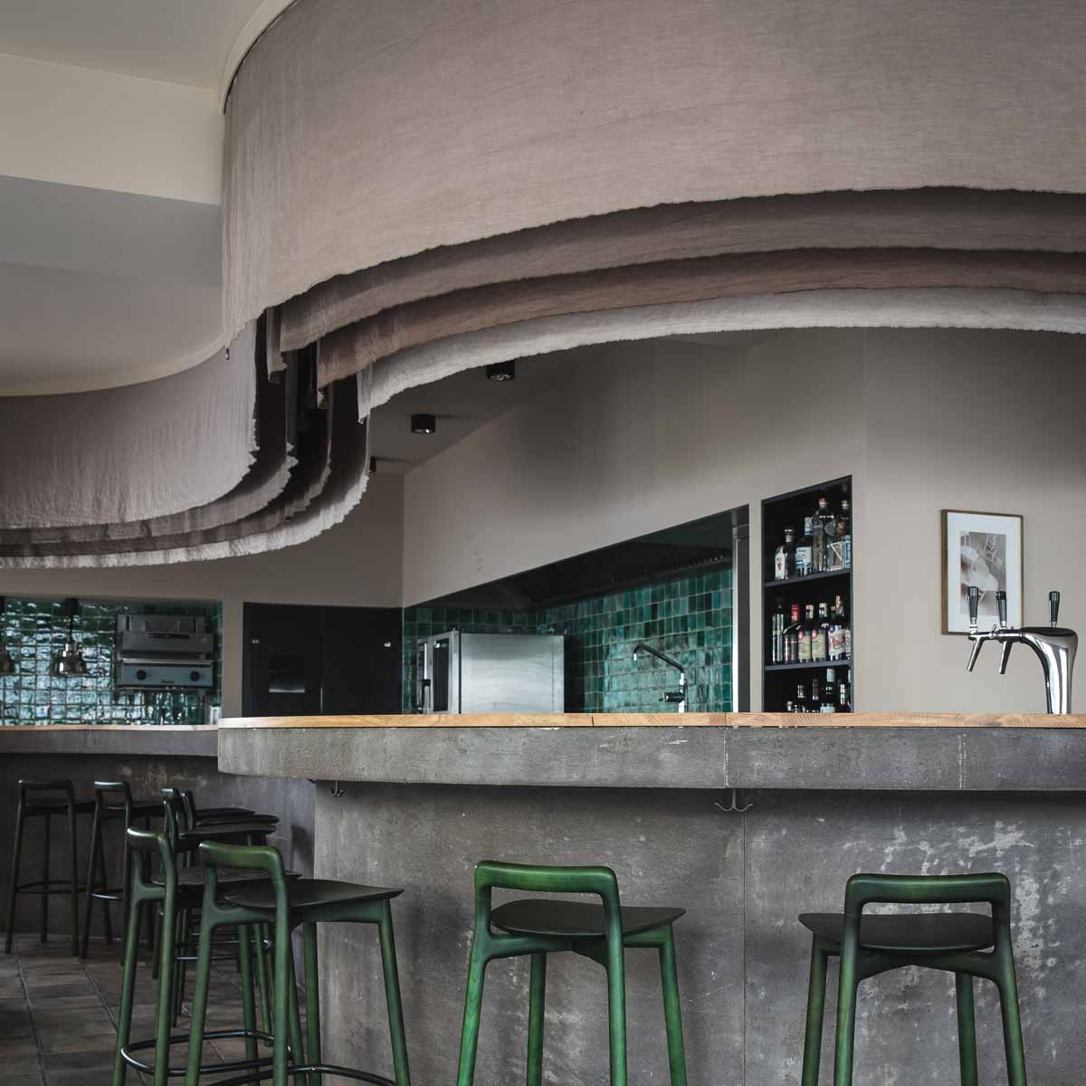 Ein langer geschwungener Tresen greift das große S des Logos auf, bringt Bewegung und damit die Dynamik der jungen Köche in den Raum. Den Schwung greifen leinene Stoffbahnen an der Decke über dem Tresen des Tisk auf, die das Design-Team eigens von Hand, in harmonisch aufeinander abgestimmten Naturtönen, eingefärbt hat.