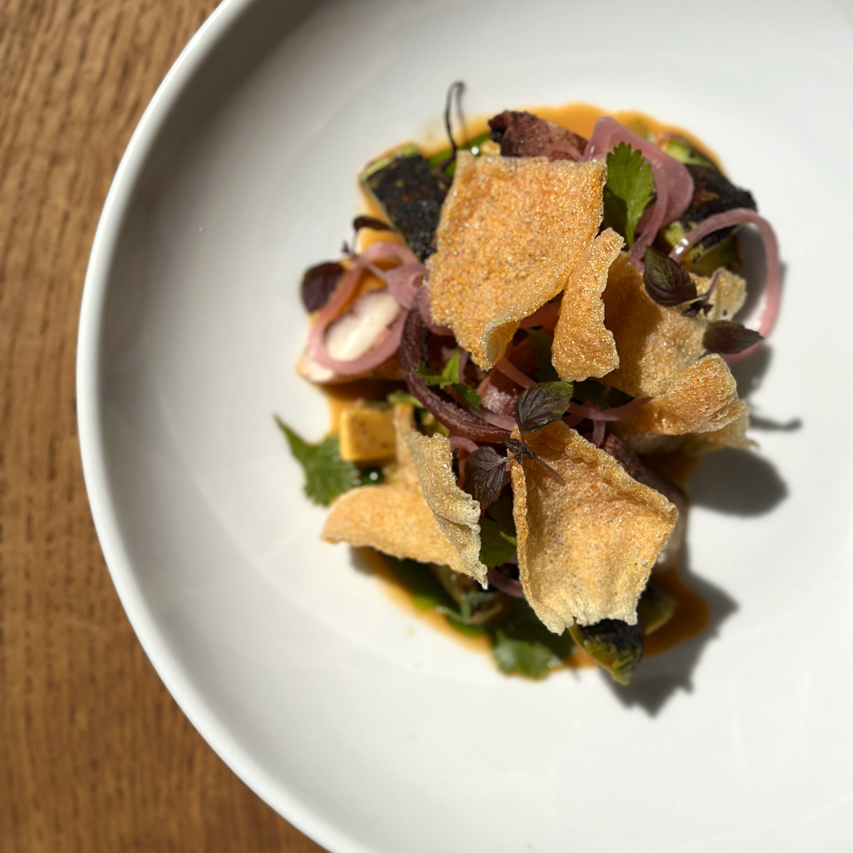 Ebenso köstlich, der „Hamachi“ mit Avocado, Tigermilch aus geräucherter Paprika und Togarashi, einer japanischen Würzmischung sowie fermentierten und frischen Radieschen, frischem Koriander und Krupek. – Ein Gang, bei dem klar wird, dass Joey Passarella ganz wundervoll mit Konsistenzen zu spielen versteht!