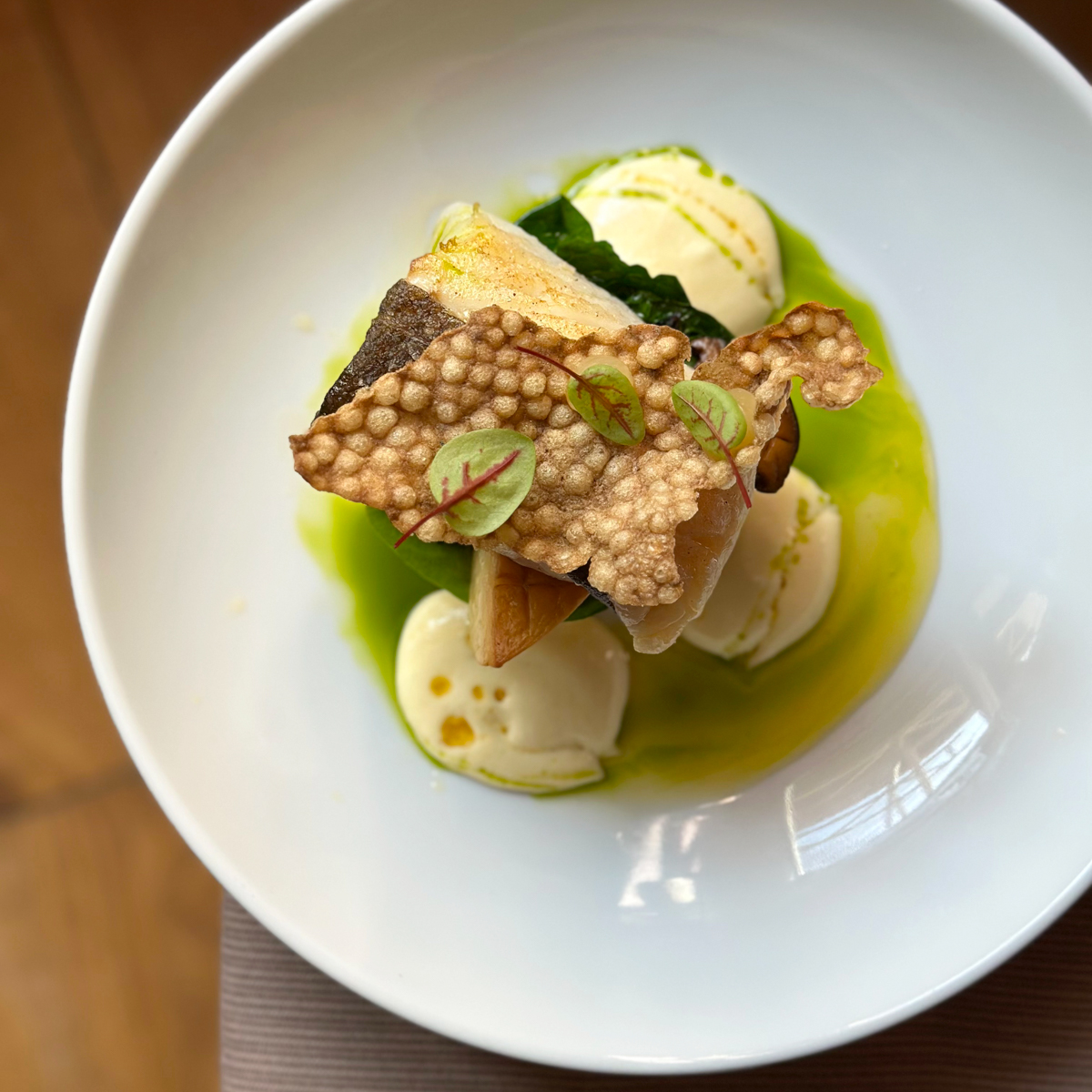 Und auch der gebratene Kabeljau mit Courgette als Creme und gebraten sowie sous-vide gegarten gelben Zucchini macht keine Ausnahme. Verfeinert ist dieser Gang mit gebackener Topinambur, Topinambur-Chips und Shisoblatt. – Wir lieben jeden Bissen.