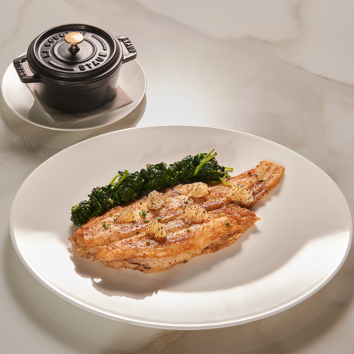 „Nach eineinhalb Jahren Eisdiele juckte es mir aber doch in den Fingern wieder zu kochen“, resümiert er. Nun kehrt er im Restaurant Wilhelm zur zeitgenössisch interpretierten französischen Küche seines Ausbildungsbetriebs Schwarzer Adler zurück. Und so verwundert es ebenso wenig, dass unser Mahl handwerklich einwandfrei daherkommt: gebackener Kalbskopf mit Frühlingsgemüse und einer feinen Sauce Gribiche, sowie eine köstliche Hummer-Bisque mit Fagottini-Täschchen als köstliche Einlage. Der dazu servierte Sancerre von der Loire sowie ein Weißburgunder von der Nahe schmiegen sich wunderbar in beide Vorspeisen.