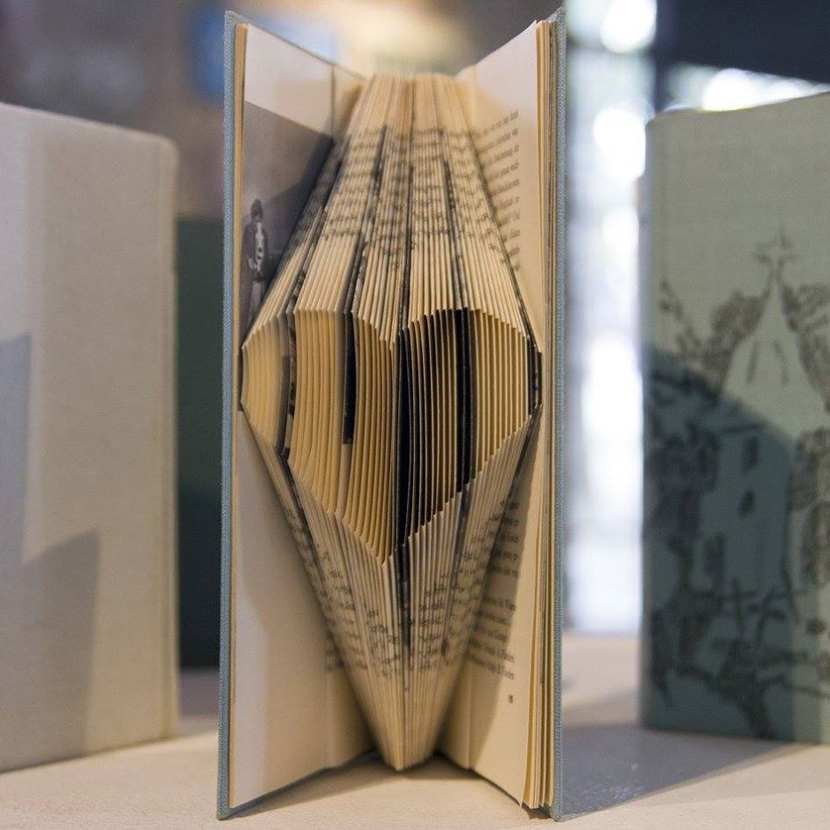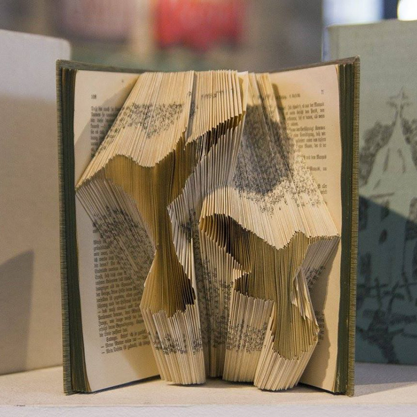 Bei einem Spaziergang entlang des Maybachufers kann es schon mal passieren, dass man an einem kleinen, etwas verstaubten Schaufenster innehält und aus dem Staunen nicht wieder heraus kommt. Das Wort Faltblatt erhält bei Moriel Briller eine ganz neue Qualität. Unter dem Namen Simply Make verhilft sie hier alten Büchern zu einem zweiten Leben als Kunstwerk.
