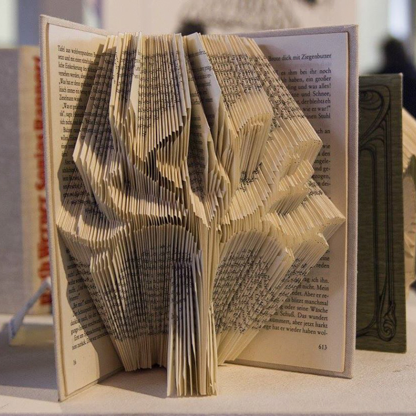 Die Bücher, die die gebürtige Israelin zur Kunst macht, findet sie oft auf der Straße in zurückgelassenen Bücherkisten oder abgelegt in U-Bahnstationen. Recycling auf berührende Art und Weise. Die Motive ihrer Faltkunst sind so vielfältig wie die Bücher selbst. Meistens hat ihr Literatur-Origami dabei einen Bezug zum Inhalt des Buches. Mal ist es ein Herz, häufig Wörter oder kurze Sätze, auch Bäume hat sie schon aus den teils vergilbten Seiten gefaltet.