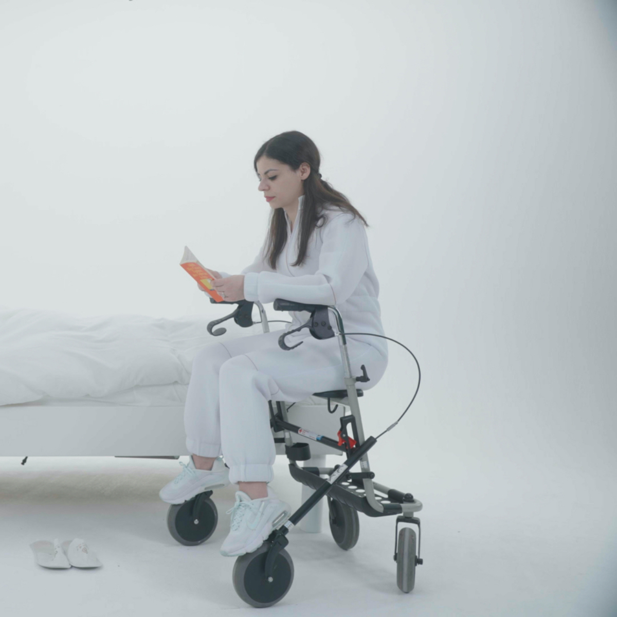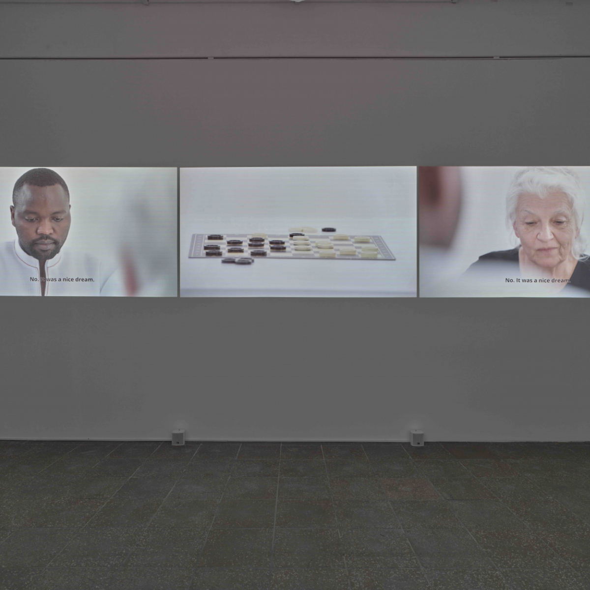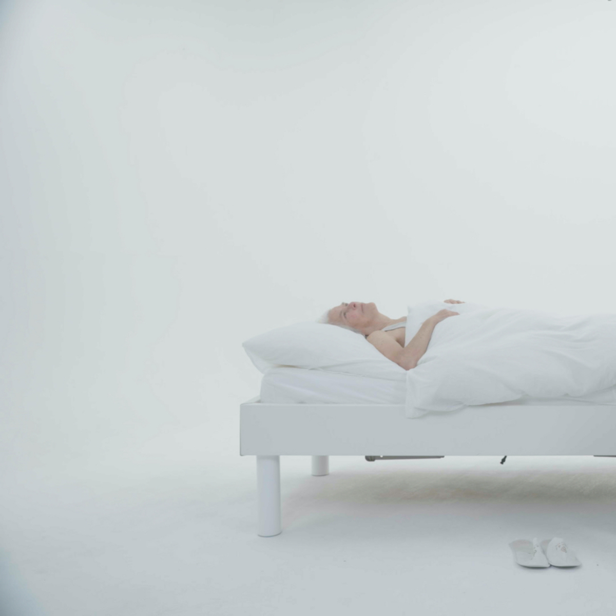 Im Zentrum der Ausstellung Slow Motion steht ein futuristischer Anleitungsfilm, in dem Pflegekräfte und alte Menschen ihre alltäglichen Routinen demonstrieren; eine Choreografie der Beziehungen zwischen Pfleger: innen und pflegebedürftigen Menschen.“