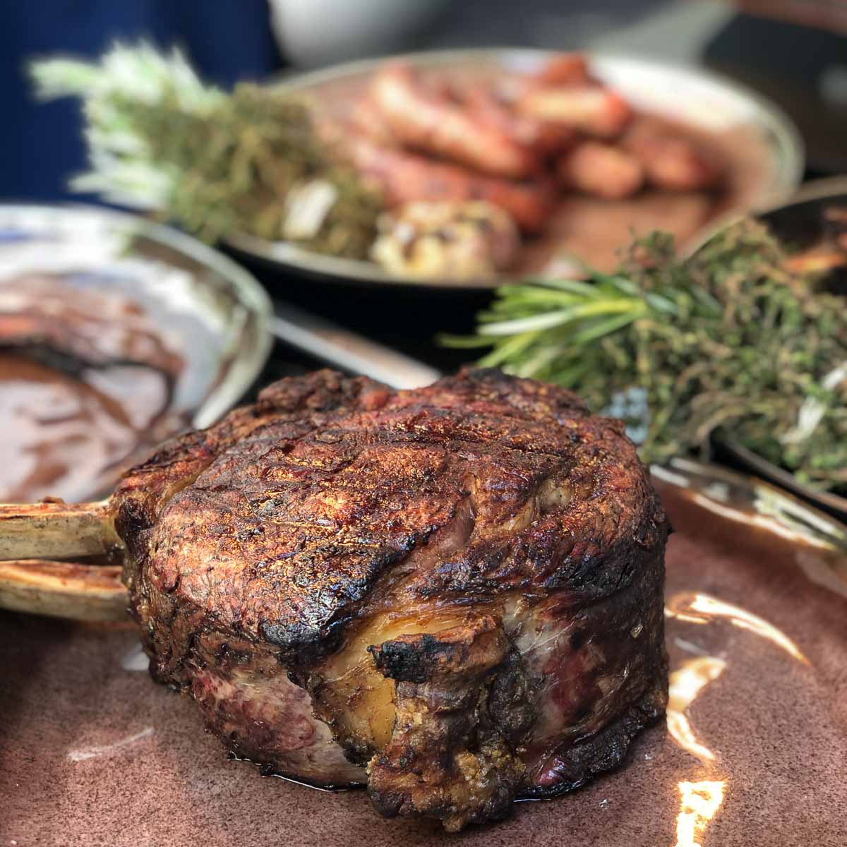 Vom Grill kommen beispielsweise Prime Ribs mit Rosmarinöl, die katalanischen Würste "Butifarra" mit Chillimarmelade, die Pérez exklusiv liefern lässt und mariniertes Hähnchen mit Kräuterchimchurry. Fisch und Meeresfrüchte gesellen sich als Austern mit Zitronenvinaigrette, mariniertem Oktopus, Rote Garnelen mit geröstetem Knoblauch oder gegrilltem Wolfsbarsch mit Zitrone und Thymian. Vegetarisch haben uns die gegrillten Austernpilze und der Spargel mit Majoran-Zitronenöl begeistert.