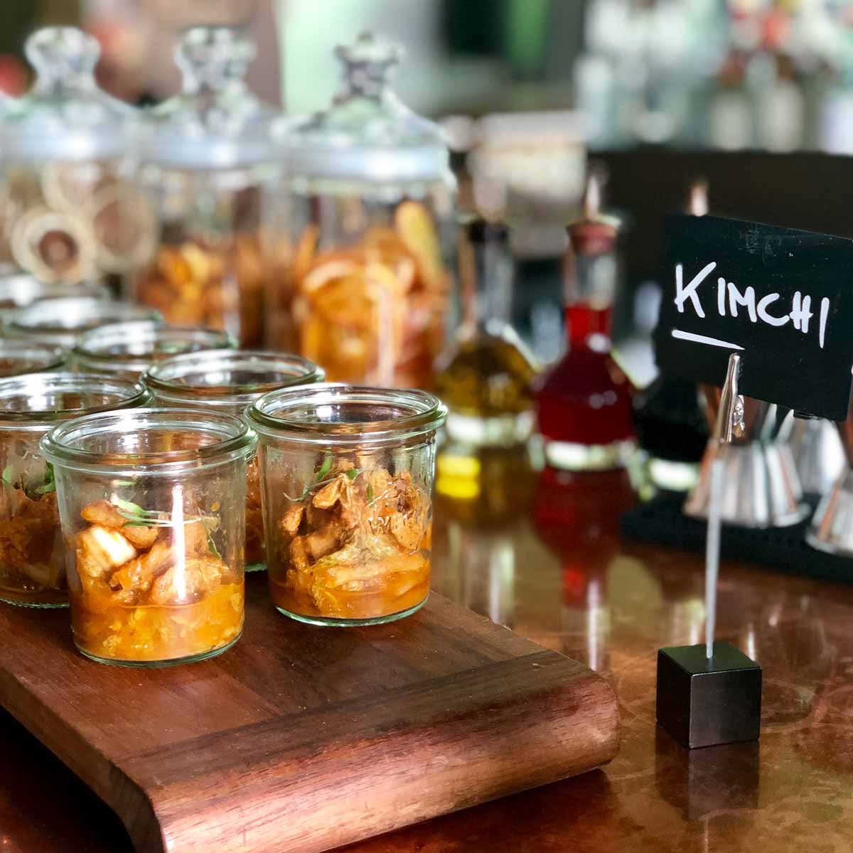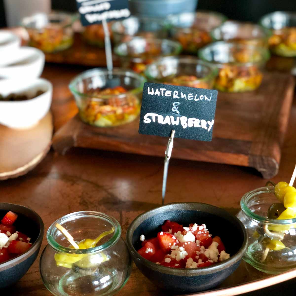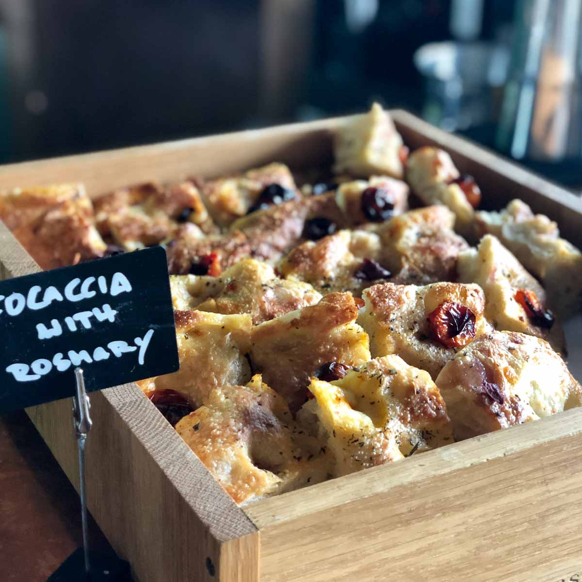 Als weitere Beilagen warten zudem Gläser und Schälchen gefüllt mit kleinen Salade Nicoise, hausgemachtem Kimchi und Hummus oder Heirloom-Tomatensalat und mariniertes Grillgemüse. Dazu gibt es Spezialitäten, wie Büffelmozzarella mit Olivenöl und Pfeffer oder spanischen Bresaola. Neben einer Auswahl an hervorragendem Brot duftet eine frisch gebackene Foccacia mit Rosmarin, schwarzen Oliven und Kirschtomaten verführerisch.