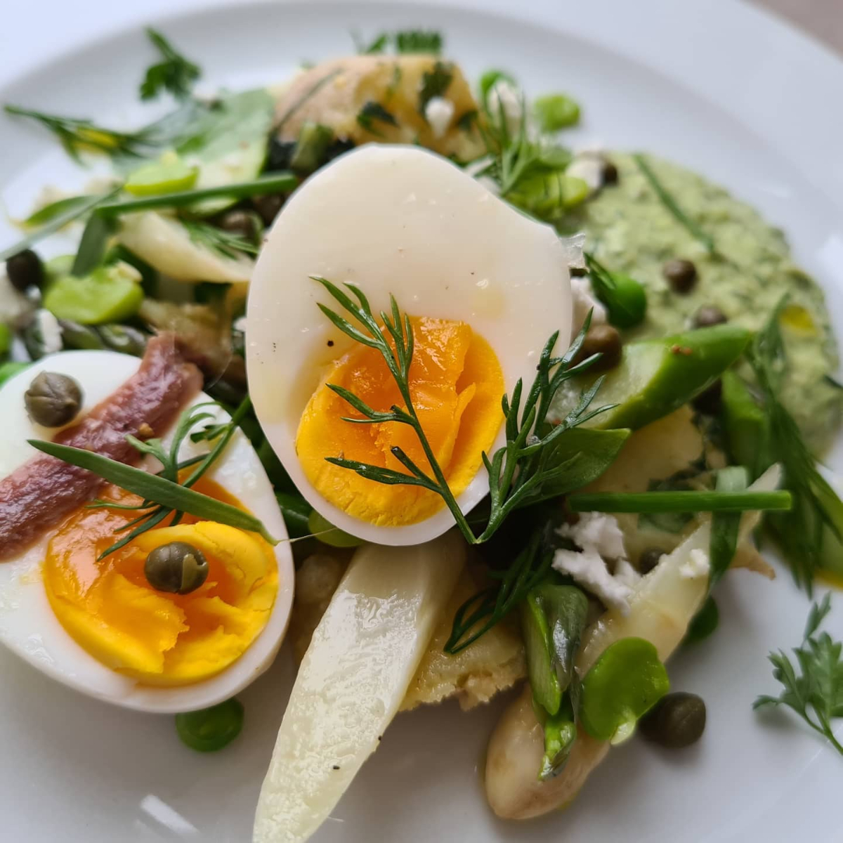 Sie drückt uns zwei Schatzkarten in die Hand und erinnert noch einmal die Corona-Regeln und Maskenpflicht vor den teilnehmenden Lokalen. Es gibt zwar keine feste Route, aber einen Stadt-Plan von Kreuzberg und drei Fragezeichen, die es unbedingt zu ergründen gilt. Vom Two Trick Pony gibt es sodann auch den ersten Gang: Weideei mit Sardelle auf grünem und weißem Spargel, Bärlauch und Feta.