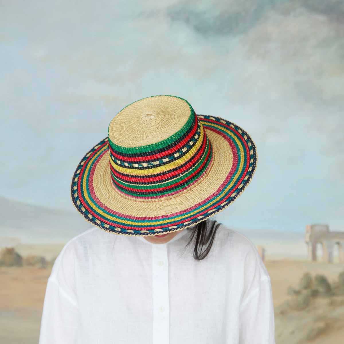 Berlins renommierteste Modistin Fiona Bennett wartet in diesem Jahr mit einer zweiten Edition an farbenfrohen Strohhüten auf, die erneut in traditioneller Handarbeit in einem Dorf der Bolgatanga Region in Ghana geflochten wurden. Dabei scheinen Fiona Bennetts Entwürfe vielmehr aus den kleinen französischen Küstenorten der 50er Jahre herüber geweht zu sein, wo Künstler und Literaten sich einst in der Sommerfrische trafen.