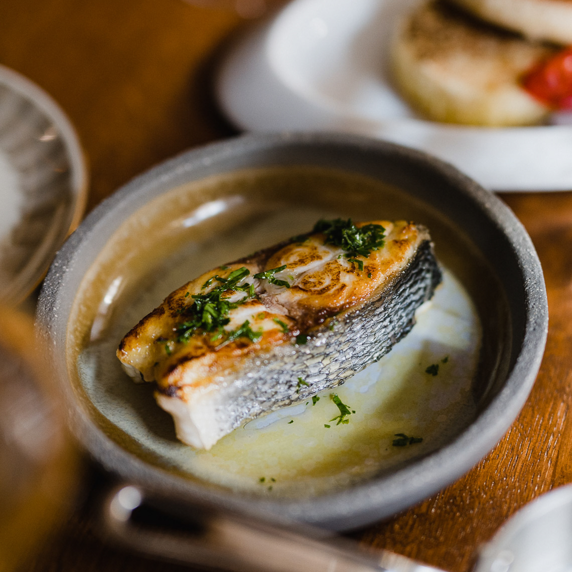 Wir nehmen das natürlich gerne an und kosten den Brancin, Loup de mer mit blanchiertem Lauch, Püree aus Zitronenschalen, gerösteten Sonnenblumenkernen, Meerfenchel, Rahmsauce und Wildfond. Mir gegenüber gibt es die vegetarische Option aus Brandenburger Pastinake von Bauer Direkt, gegart im Schalensud aus Weißwein und Zucker, dazu ein Püree aus den Pastinakenabschnitten und eine Beberitzen-Emulsion. Beide Teller lassen sich, wie alle Gänge der verschiedenen Fine Dining Menüs (85 bis 125 Euro) auch einzeln bestellen.