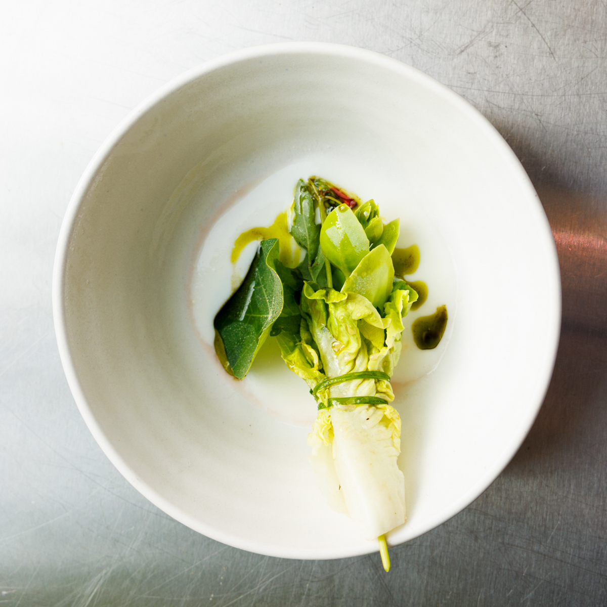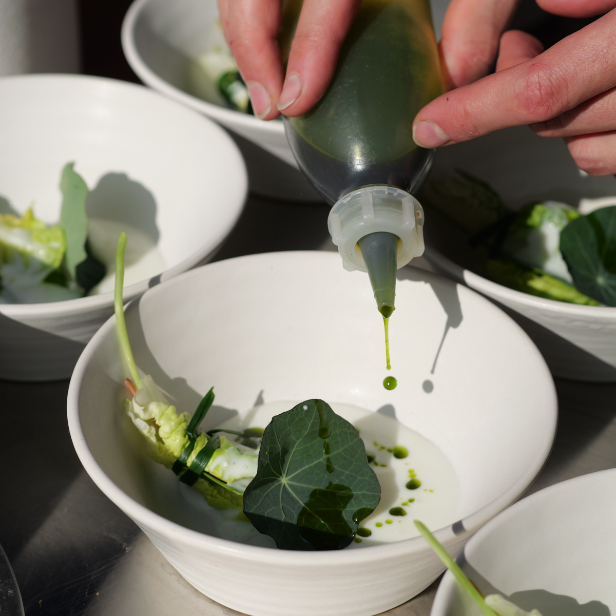 Die Küche führt Maximilian Haack, ehemaliger Sous-Chef des Rutz und heute im Aerde aktiv. Hier kocht er jedoch weniger, vielmehr grillt und smoked er, legt ein und fermentiert – und manches belässt er auch bewusst roh. Alles kommt aus dem Beet nebenan oder aus der unmittelbaren Region. Das Dessert kreiert Sam van Schagen, die in Paris ausgebildete Chef-Patissière des Restaurants Ei und zuvor ebenfalls im Restaurant Aerde.