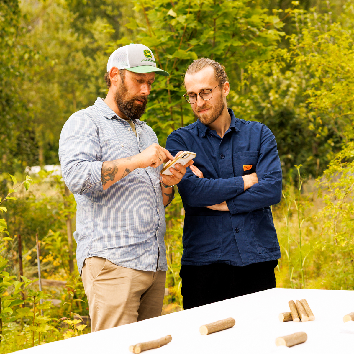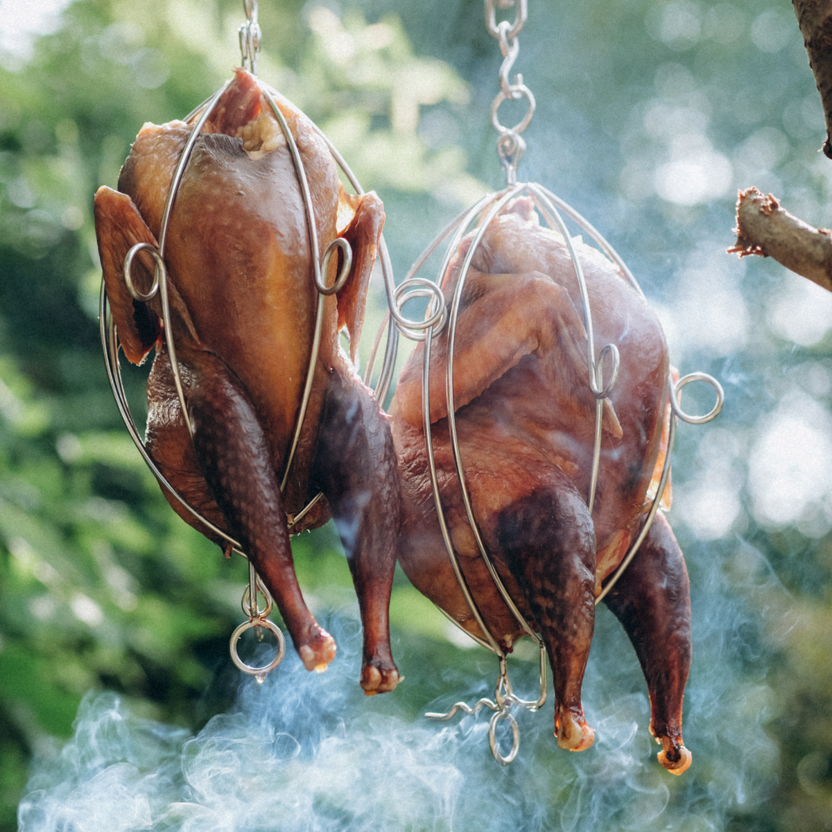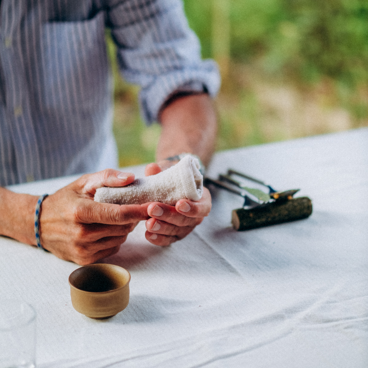 Entsprechend beginnt die Menüfolge gern mit Kräutern und Pilzen, gepimpt mit einer Dashi aus Waldpilzen. Es folgen Sauerteig-Stockbrot und ein Risotto aus Ember-Korn, dazu eine langsam gesmokte Perlhuhnbrust, die auf dem japanischen Schamott-Grill knusprig fertig gart.