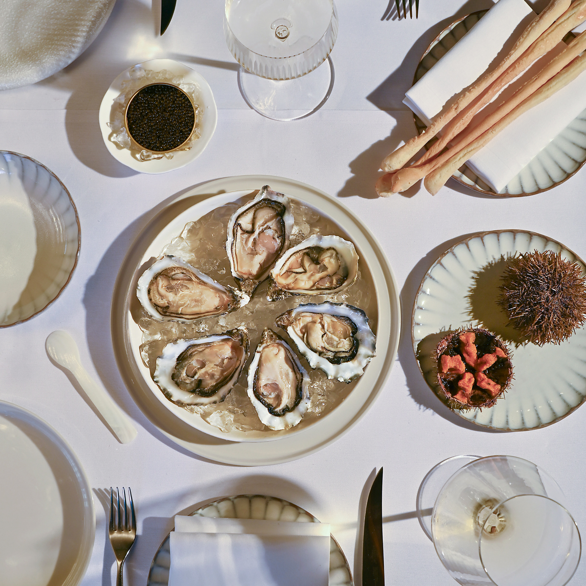 Zum Start erreicht uns ein bunt gefüllter Brotkorb mit unterschiedlichen Crackern, Grissini und zwei Sorten Brot – die Butter dazu ist erstklassig! Wir teilen uns zwei Vorspeisen: ein King Crab‑Bein, serviert mit exzellenter Maître‑d’Hôtel‑Butter, gefolgt von einem Steak‑Tatar aus 40 Tage gereiftem Fleisch, veredelt mit Scampi, wodurch eine wundervolle Schlozigkeit entsteht, begleitet von gleich drei Saucen, darunter eine kräftige Meerrettichvariante und eine cremige Bisque‑Mayonnaise.