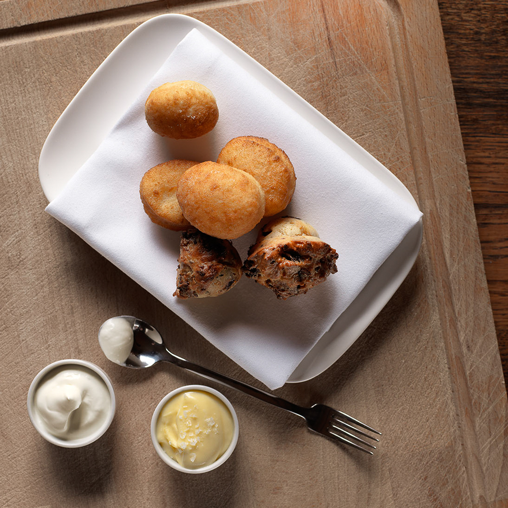 Skykitchen. Vier verschiedene Brötchen- und Brotsorten werden hier auf einem eleganten, schmalen Holztablett über den Dächern von Berlin gereicht. Namentlich: Speck-Zwiebel-Brötchen, Laugenbrötchen, Cheddarbrötchen und Vitalbrot. Täglich frisch vom Küchenteam zubereitet werden dazu aufgeschlagene gesalzene Butter und ein Paprika-Frischkäse-Dip gereicht. Im wahrsten Sinne des Wortes "himmlisch" sind vor allem das Laugen- und das Cheddarbrötchen.
