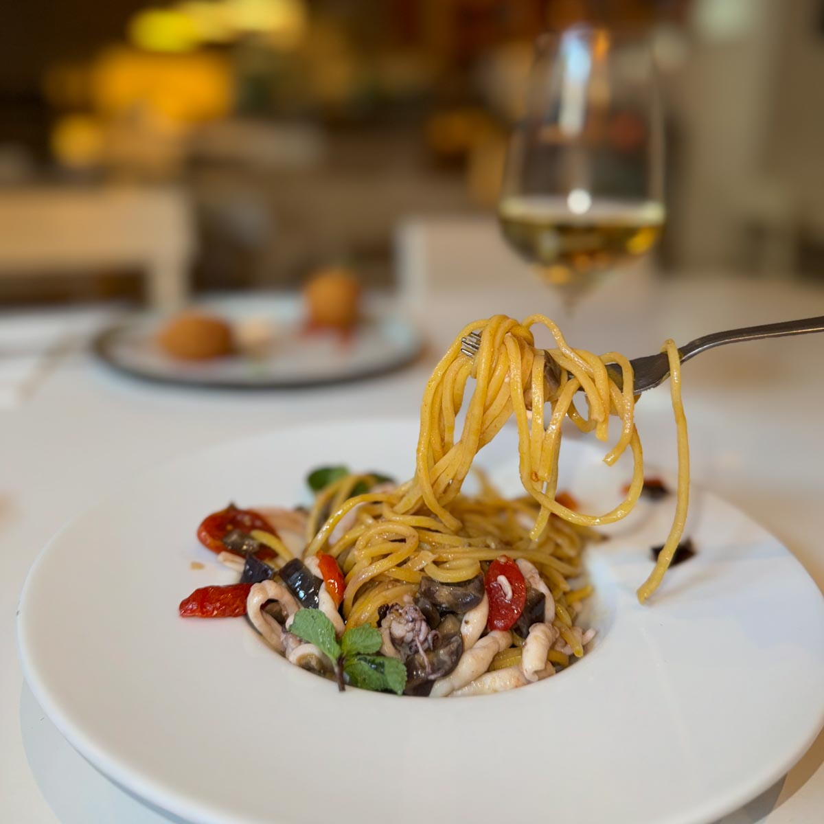 Die Karte im Vino e Cucina wechselt wöchentlich. Bei einem Campari Spritz verschaffen wir uns einen Überblick. Wir naschen von der frischen Focaccia, von grünen Oliven, und obgleich die Karte übersichtlich ist, können wir uns kaum entscheiden. Wir werden alles teilen, so viel ist klar. Und am knusprigen Oktopus auf Kartoffel-Zitronencreme als Vorspeise führt schon mal kein Weg vorbei.