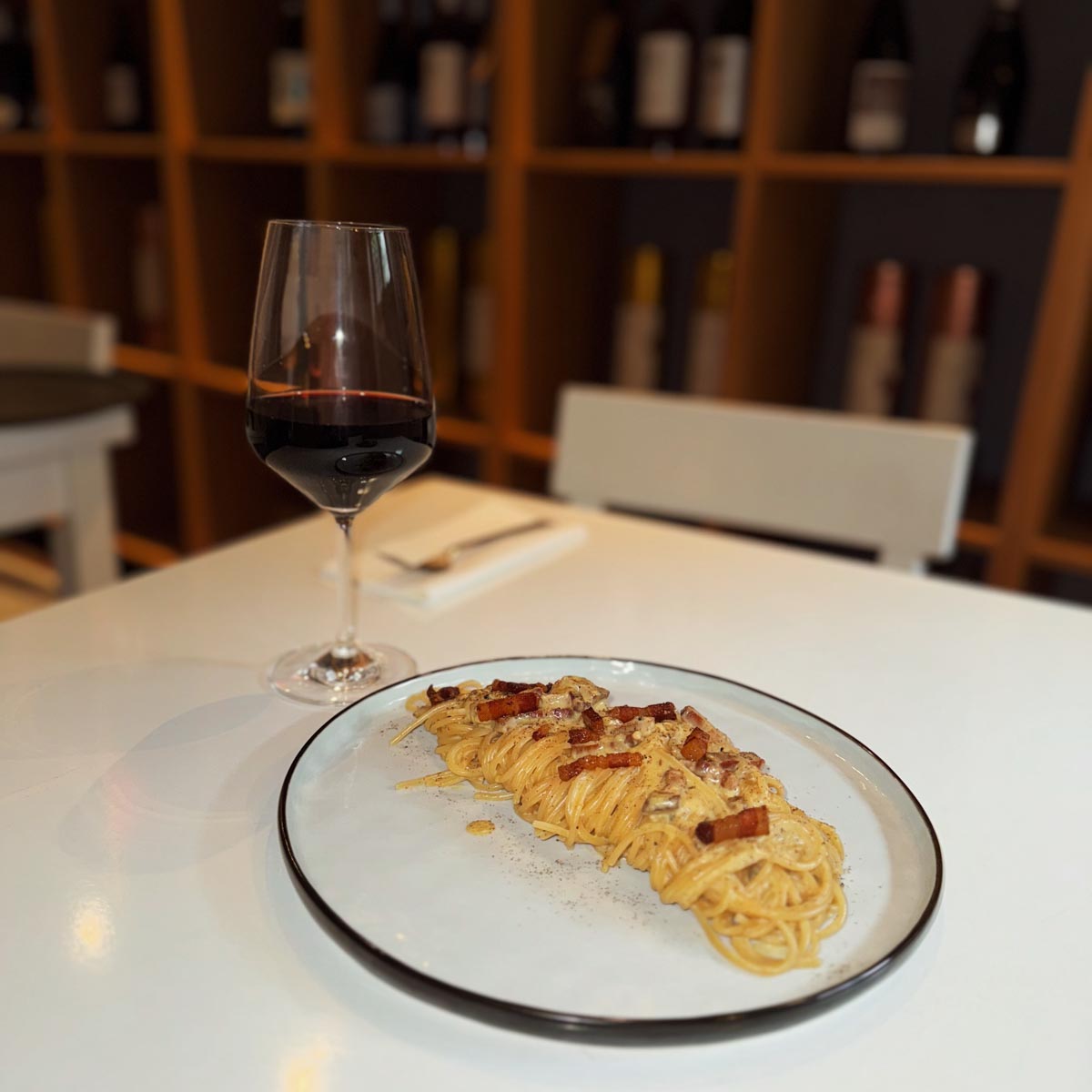 Sehr zufrieden bitten wir um eine kurze Pause, bevor wir uns als Secondi die hervorragenden Tagliolini alla Carbonara mit schwarzem Trüffel, knusprigem Bauchspeck, Ei und Parmesan servieren lassen. Wir schwärmen: Der Aufwand von hausgemachter Pasta lohnt sich einfach. Und diese hier ist ganz besonders gut!