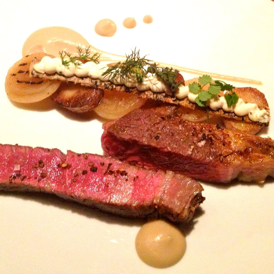 Die Tische um uns herum sind (an einem Dienstag!) nahezu alle belegt als das Dry Aged Beef als letzter Gang aufgetragen wird. Begleitet von Kartoffelscheiben und Grillschalotten, gekrönt von einem filigranen Knäckebrot mit Frischkäsecreme. Erneut ein schönes stimmiges Gericht. Weiter so, Herr Gleiß!