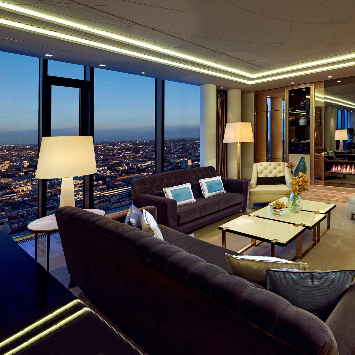 Ein klug ausgetüfteltes Lichtsystem schafft Gemütlichkeit im modern interpretierten Art déco Interieur. Das Wohnzimmer mit Schreibtisch-Nische, Essbereich und Kitchenette wirkt großzügig und elegant. Das Badezimmer, wie in allen 232 Zimmern und Suiten des 118 Meter hohen Gebäudes, mit Fußbodenheizung und TV ausgestattet, ist eine wahre Wellness-Oase. Ein leiser Vorgeschmack auf das hoch gelobte Guerlain Spa im Waldorf Astoria Berlin.