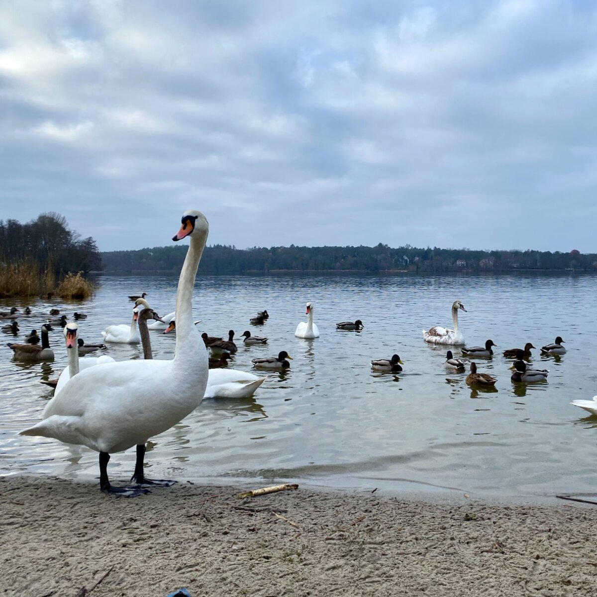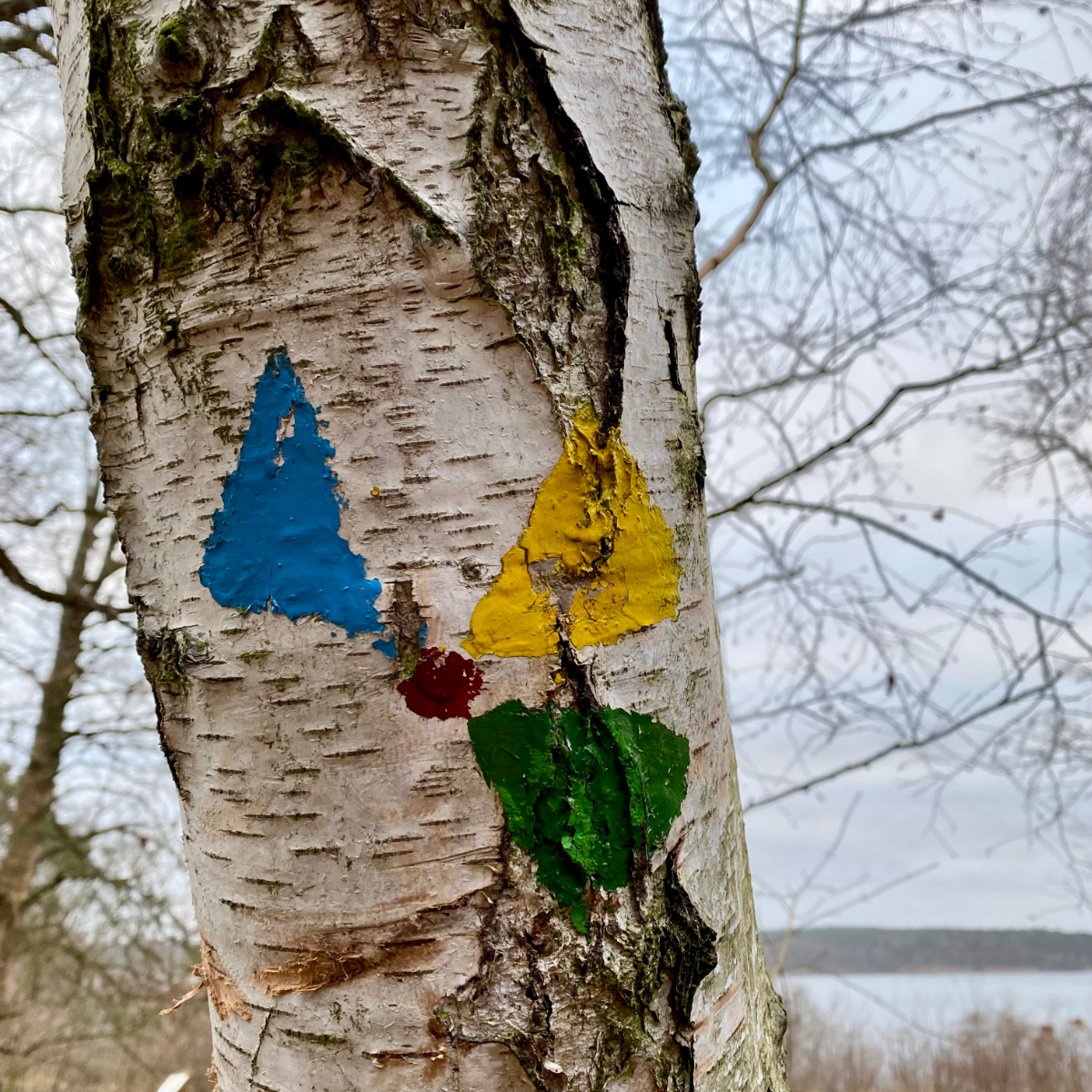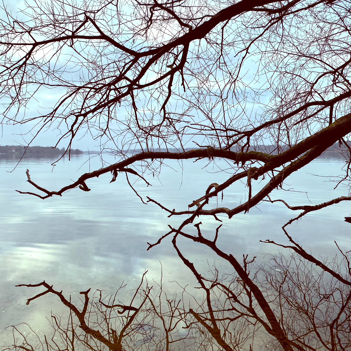 Von hier oben geht der Blick zwischen den (noch) kahlen Bäumen auf die Havel, die in der schwachen Wintersonne glitzert. Ein paar Minuten stehen wir nur da und genießen die weite, unverbaute Sicht. Dann geht es weiter – nun über weichen Waldboden. Eine Wohltat für unsere asphaltgeplagten Füße.