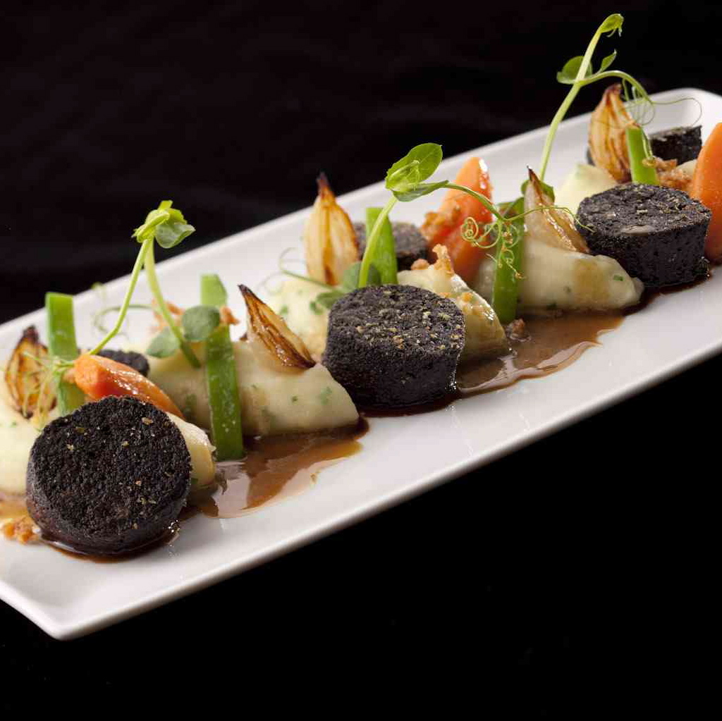 Gesalzene Butter und ein feines Schweineschmalz werden mit Berliner Sauerteigbrot und Baguette sowie kleinen Scheiben eines sehr schmackhaften glutenfreien Brotes gereicht. Wir vertiefen uns in die Karte: „Brot mit Pfälzer Hambel-Leberworscht“, gebratene Blutwurst aus Berlin mit Lauch-Kartoffelpüree & Jemüse“, „Beuthes Wollschwein Eisbein mit Kartoffelsauerkraut & Karotten“....