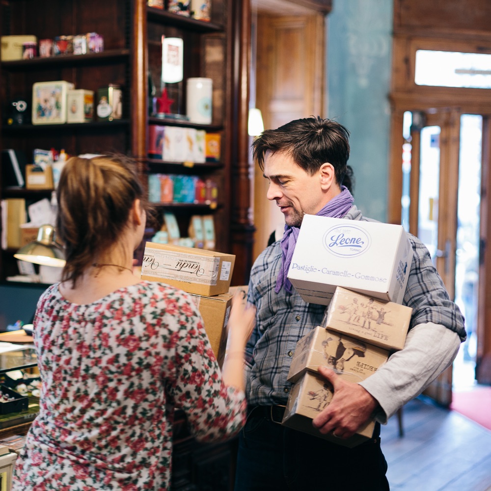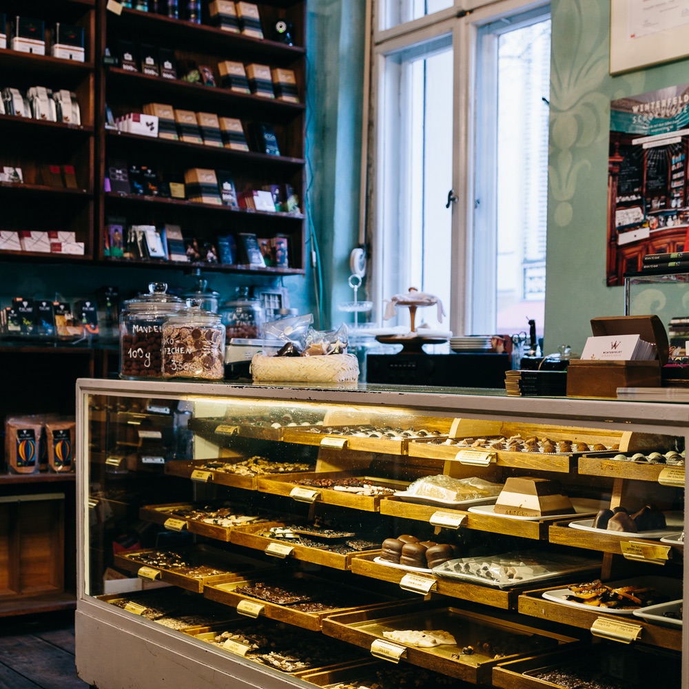 In der alten Theke warten obendrein eine Vielzahl an Bruchschokolden der in Berlin produzierten Hausmarke und feinste Pralinen unterschiedlicher Herkunft. Fertig verpackt gibt es sie hier nicht etwa in klassischen Pralinenschachteln, sondern in zauberhaften kleinen Schächtelchen aus Nepal. – Nach gefühlten Stunden verlasse ich den Laden mit tausend und einer Geschichte zu all den kleinen Produzenten und einer prall gefüllten Tüte mit dunklen Schokoladen. "Was für ein Laden!"