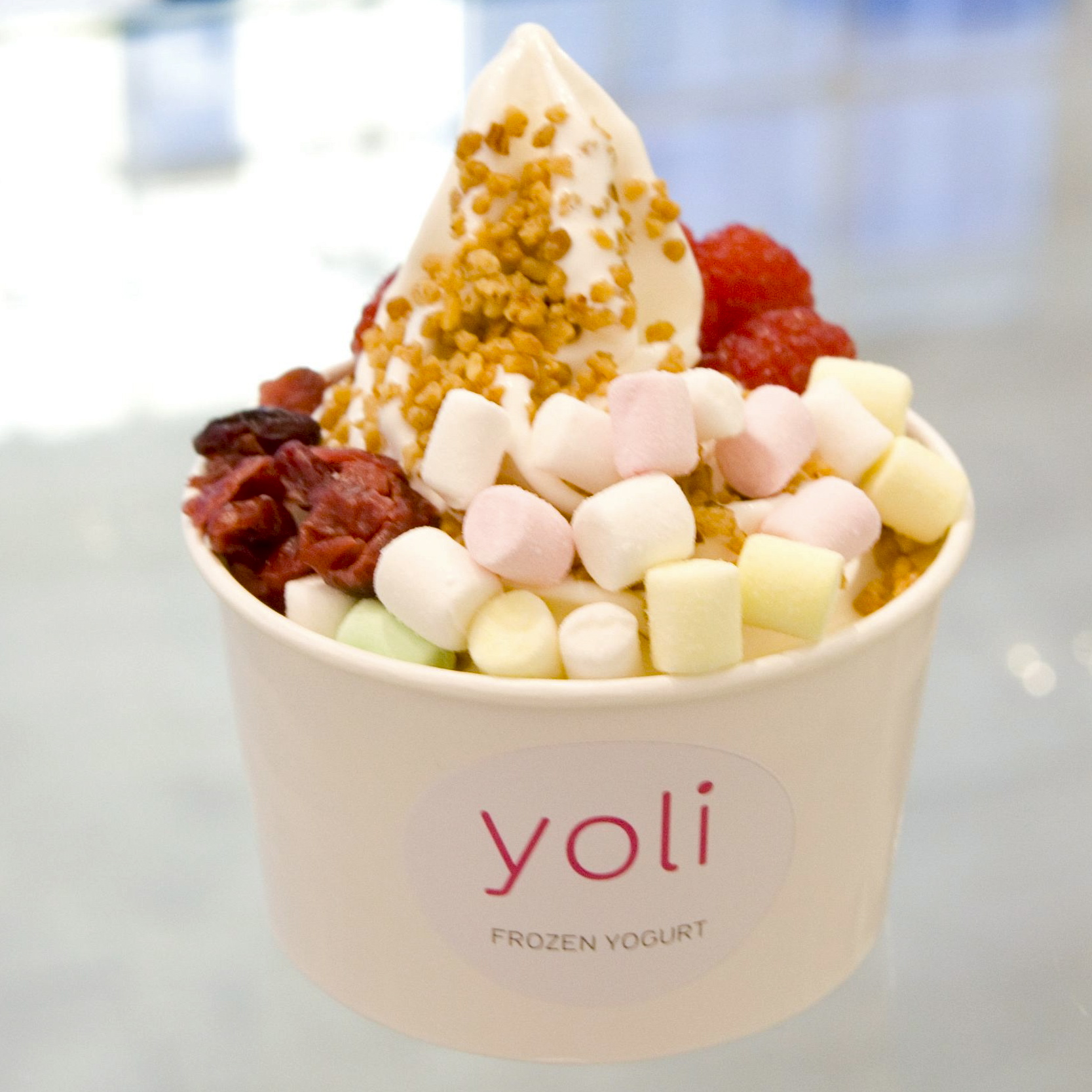 Dem Konzept von Yoli gehört die Zukunft: Wahnsinnig lecker, wahnsinnig individuell und wahnsinnig gesund. Jeder Becher wird aus zart schmelzendem Eis und Toppings wie Früchten, Soßen und Süßigkeiten zusammen gestellt. Das Eis wird aus echtem Joghurt zubereitet und enthält 0% Fett.