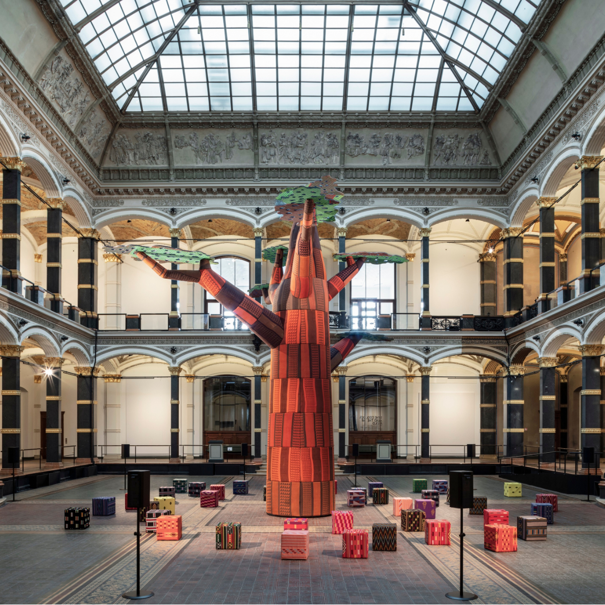 Wem das alles zu intensiv oder emotional und überwältigend ist, sei die freizugängliche ortsspezifische Installation des nigerianischen Künstlers Emeka Ogboh im Lichthof des Gropiusbaus ans Herz gelegt. Sie lädt nicht nur alle Besucher:innen mit skulpturalen und klanglichen Elementen (und Bier) zum Verweilen ein, sondern hat den ámà als Ausgangspunkt. Bei den Igbo steht das für den Dorfplatz. Also einen Ort, an dem Austausch stattfindet und Menschen sich verbinden. Menschen, die im besten Fall miteinander sprechen oder einfach nur zusammenkommen, unabhängig vom Monat und ihrer Herkunft, im Hier und Jetzt, dem einzigen Ort, an dem wir etwas ändern können.
