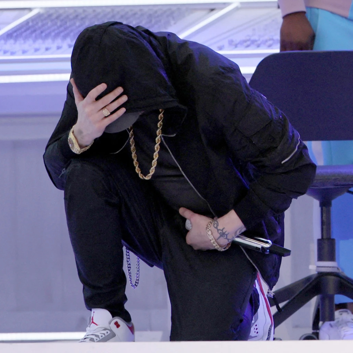 Zum einen wurden zum allerersten Mal in einer wahrlich epischen Besetzung so viele Schwarze Künstler:innen wie noch nie auf dieser Bühne zusammengebracht, darunter Mary J Blige, Kendrick Lamar, 50 Cent, Dr. Dre und Snoop Dogg. Zum anderen „took Eminem the knee“ und hielt sich den Kopf – eine in den USA und insbesondere im American Football hochaufgeladene und politische Geste, da sie an den (heute arbeitslosen) Quarterback und Aktivisten Colin Kaepernick erinnert. 2016 führte er während der Nationalhymne kniend Proteste an und weigerte sich mehrfach, während der Hymne vor dem Spiel aufzustehen, um auf Polizeigewalt und rassistische Ungerechtigkeit aufmerksam zu machen.