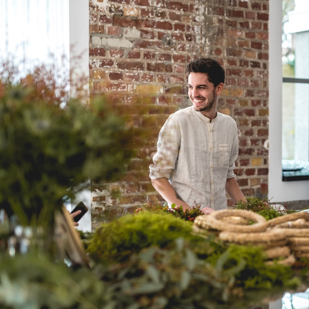 Ganz sicher ist es nämlich auch der moderne und auffällige Stil der Pflanzenarrangements, den Kund:innen hier schätzen. Neben der Arbeit im Team gefällt Lukas vor allem das Gestalterische seiner Arbeit, der Umgang mit Farben und Materialien.