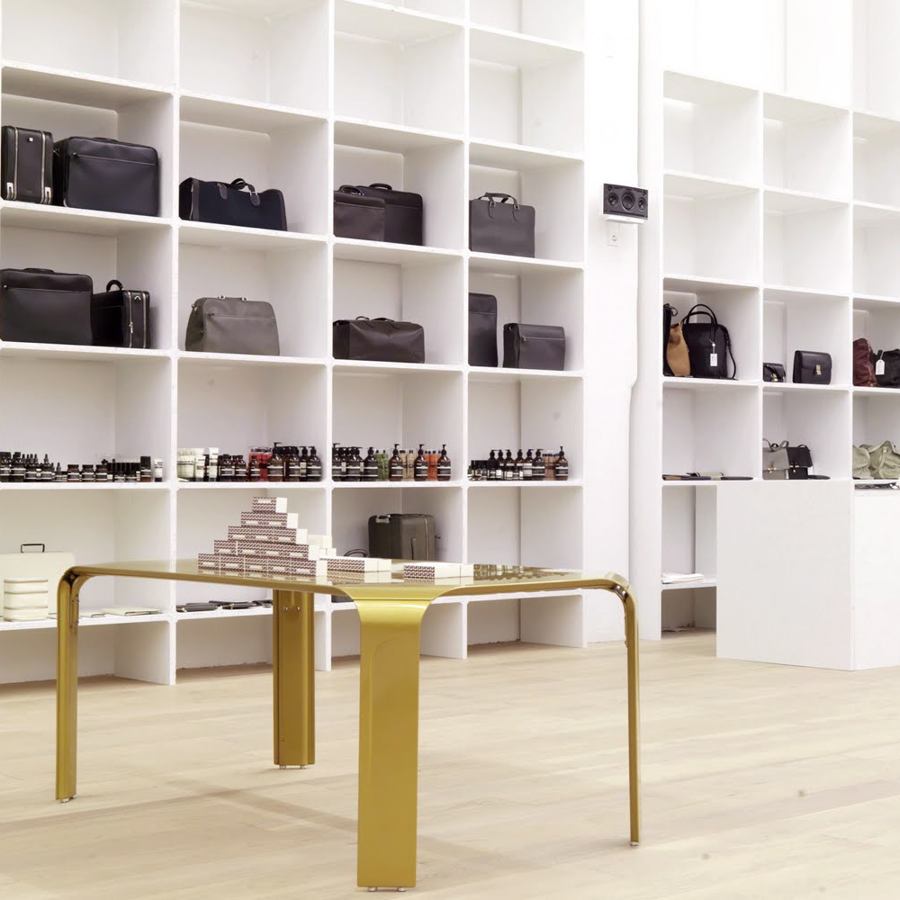 Furniture by studio E15 are presented alongside an exquisite selection of books. Irresistible care products by Aésop staged next to an eccentric selection of Nymphenburg porcelain.