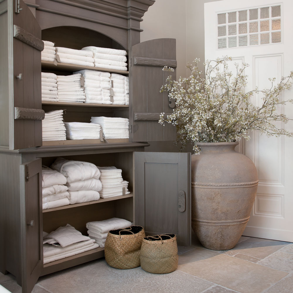 I stroll through the bed- and guest-room, sighting a large wreath by Hoffz – the brand that produces most of the pieces available here – and am struck by a collection of old Indonesian vases, marked as originals with little seals. Further down I spot bedding by Arte Pura and room scents by Linari of Hamburg.