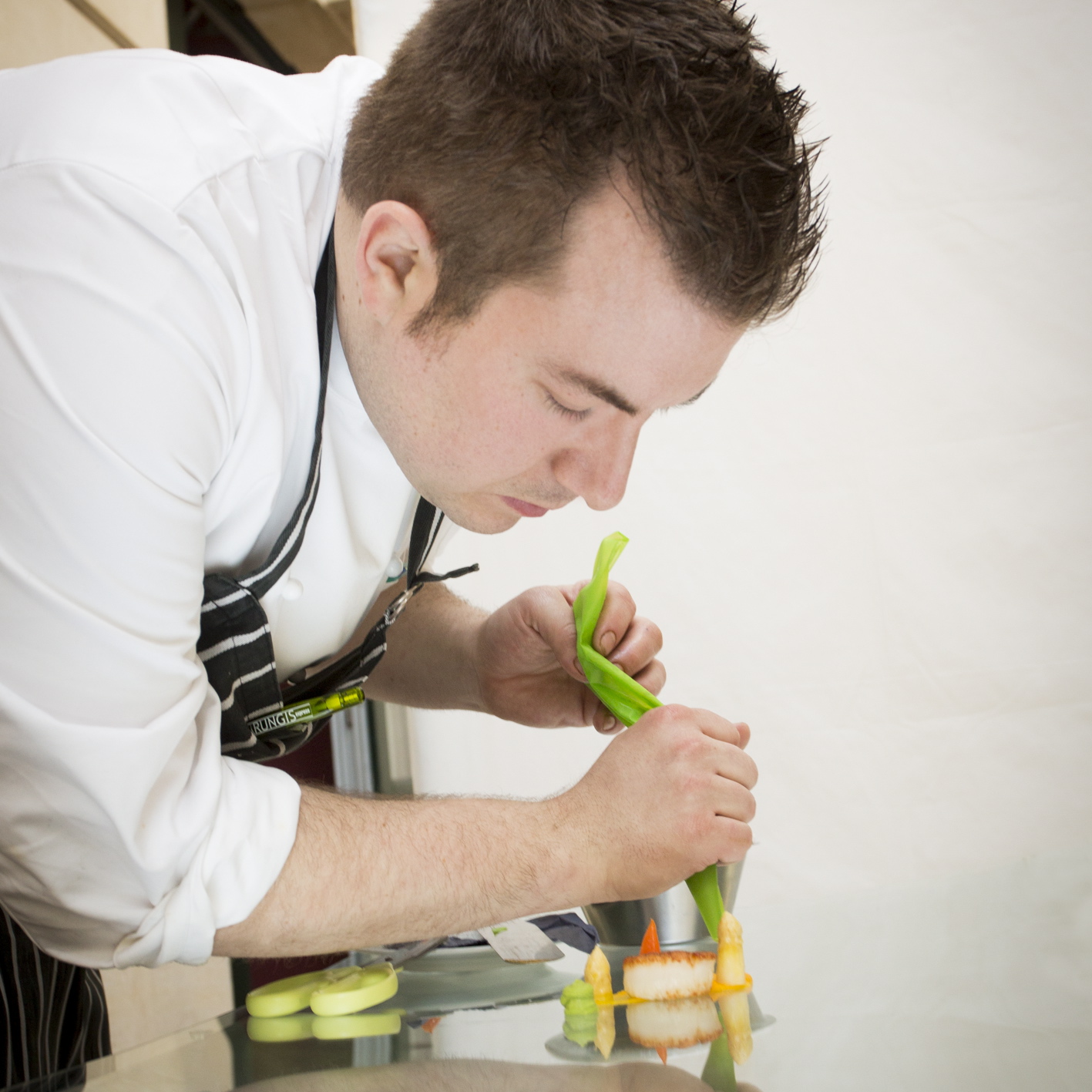 The cherry on top was the dessert that ended our menu: ‘Strawberries with Passion Fruit and Ivoire Chocolate’. Imagine small mushrooms with a shaft of strawberries and a chocolate cover, alongside tiny cylinders made of passionfruit-creme in the midst of cookie crumbles and drops of purée. Grand!