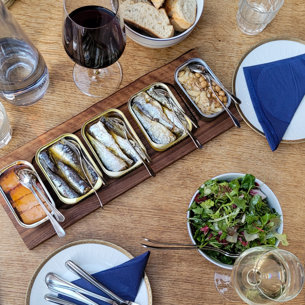 To cover a range, we decide, with some advisory support, on a board to share with five different tins. The elongated boards are a custom construction, magnets keep the cans from slipping. This is accompanied by bread and a light, fresh salad with fruity vinaigrette, the latter helping to neutralise the palate between bites of fish.