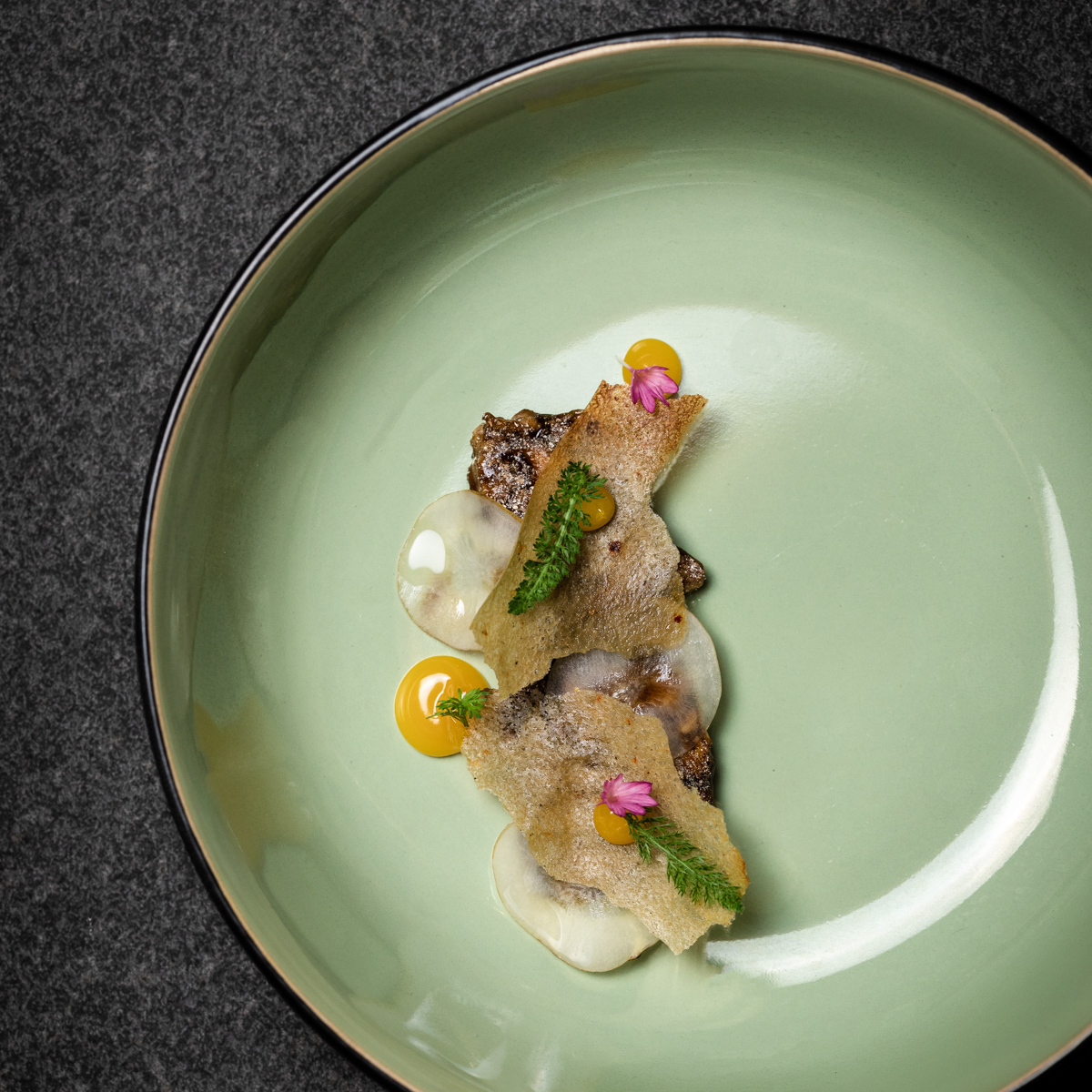 The amuse bouche is three-fold, featuring among other things a crispy algae cracker with a crab cream. This is followed by a twofold of scallops or its vegetarian variant with a filigree cabbage cap and a buttermilk base drizzled with dill oil and delightful buckthorn pearls. But it’s a neck-to-neck race with the ray wings set within a velvety bisque with fermented carrot, chili, miso, and sunflower seeds.