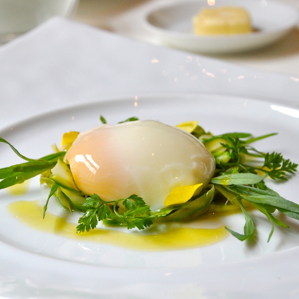 To start off we were offered champagne but we stuck with water and took a look at the lunch menu. The dishes change seasonally and you can choose between five appetizers, five entrées and four desserts. One creation sounds better than the next one. We finally decided upon ‘Onsen Tamago with Green Asparagus Tagliatelle and Basil Foam’ for starters and the fish entrée.