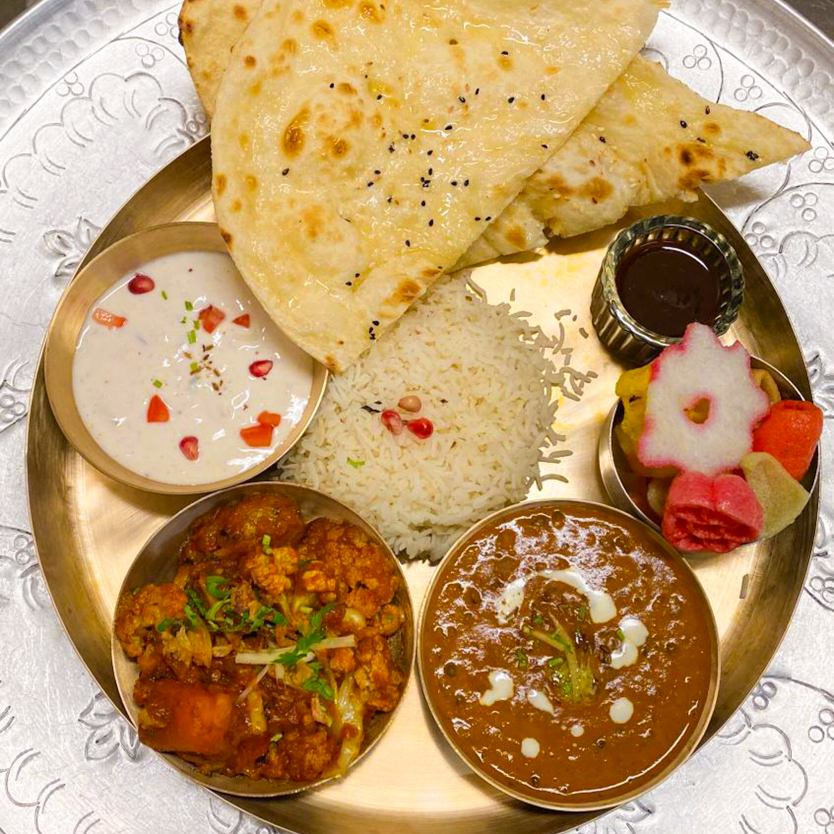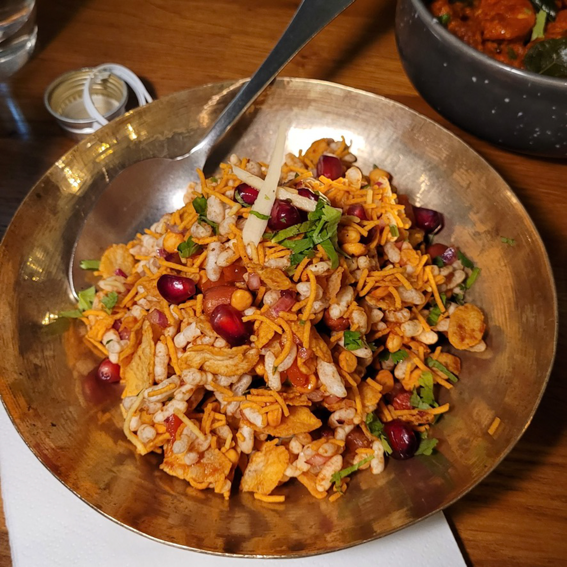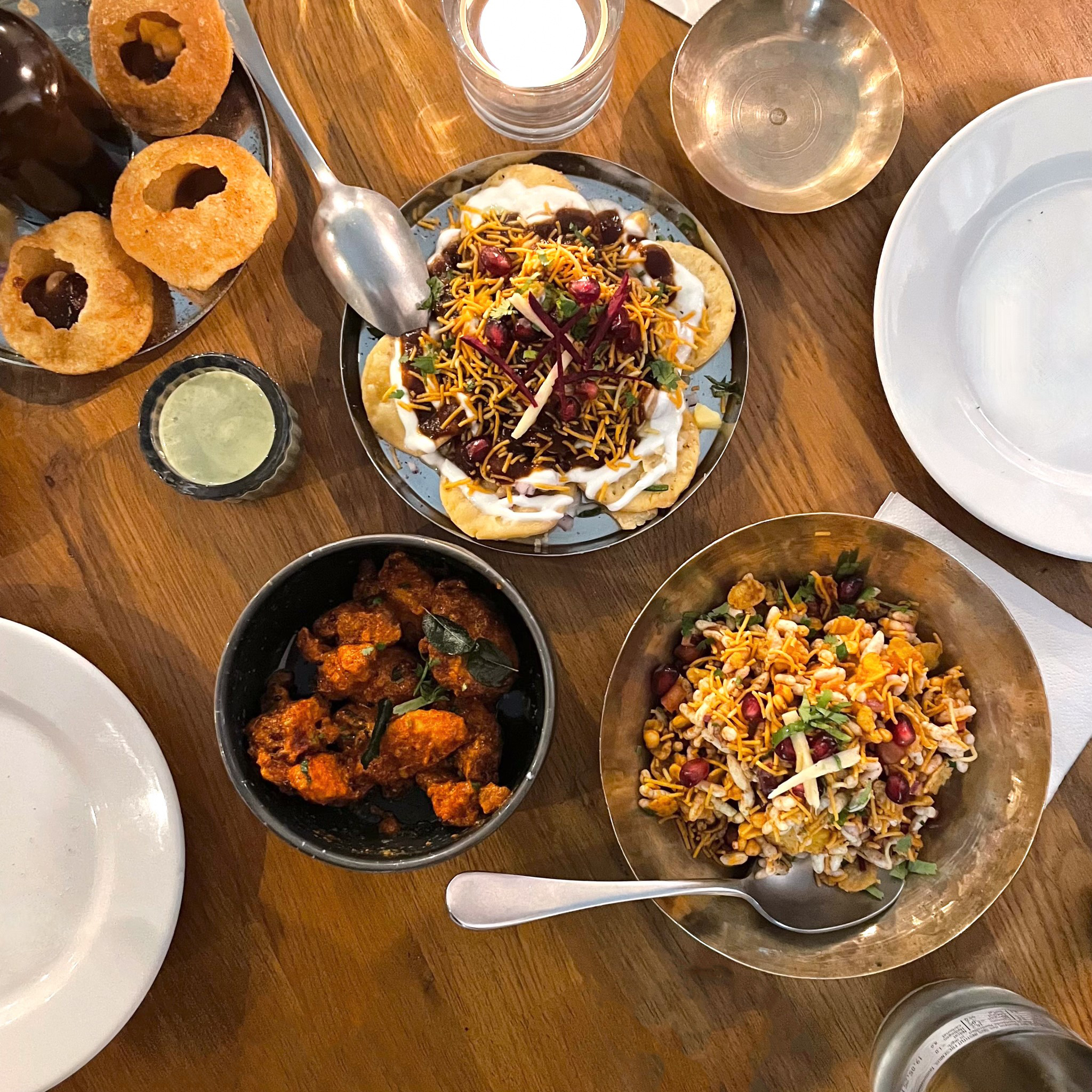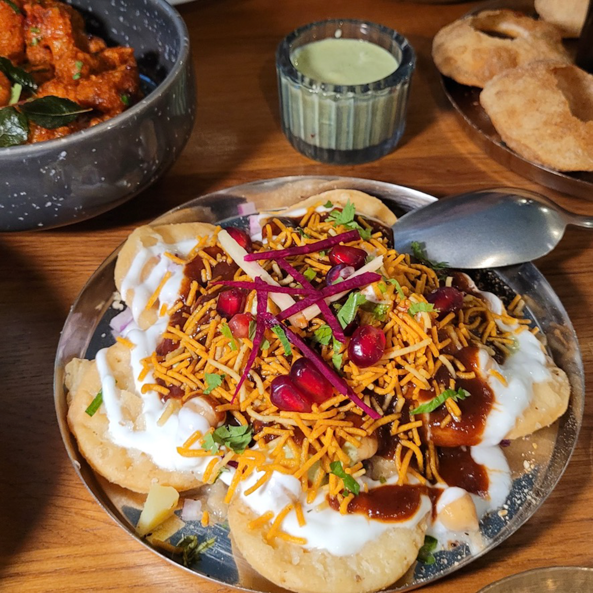 It isn't easy to pick a favourite. Each dish is so rounded and aromatic that we would recommend them all. Starting with "Bombay Bhel Puri", a speciality from Mumbai with crispy spicy puffed rice, potatoes, onions, tamarind and tomatoes, to "Naidu's Fried Chicken", deep-fried chicken pieces in cornflake breading with mustard seeds and curry leaves, to "Papdi Chaat", crispy flour and semolina chips topped with potatoes, chickpeas, onions, tamarind, chilli, coriander and yoghurt as starters.