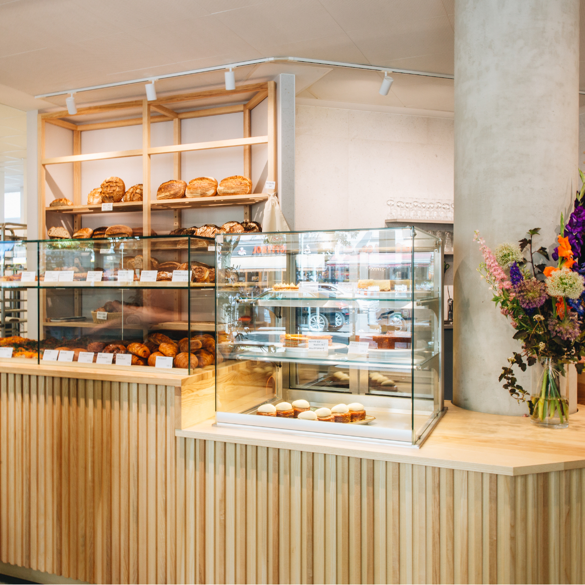 It's Monday morning and the bright, modernly designed store café is already bustling with activity. The specialty of the house is a wide variety of breads based on sourdough, which are displayed attractively on the wall shelf, in front of which is the counter display case that holds other delicacies for sweet tooths: Cheesecake, cardamom espresso tart or vegan chocolate cake? Oh, we'll just have a little bit of everything!