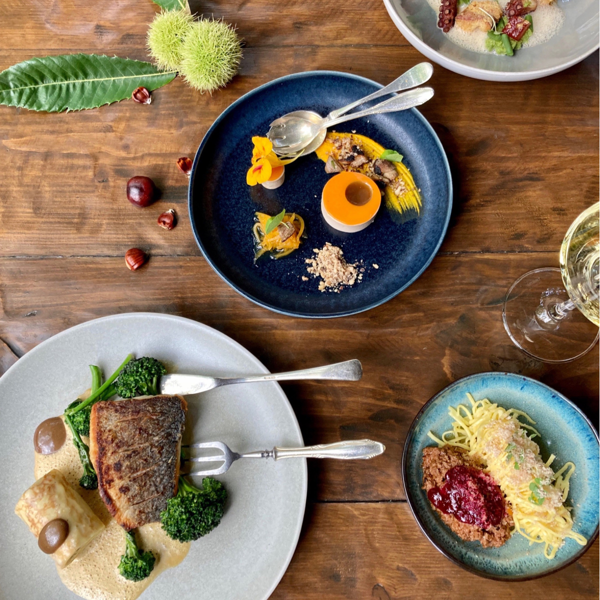 The barley risotto with pumpkin wrapped in batter and a pompon blanc mushroom taste beautifully earthy, complemented by the freshness of pickled pumpkin. Braised ox cheeks meet crunchy pak choi and truffled udon noodles and guinea fowl breast on roasted Jerusalem artichoke with potato croquettes. Our favourite course, however, is the bread dumplings with pulled beef and pickled onion on top.