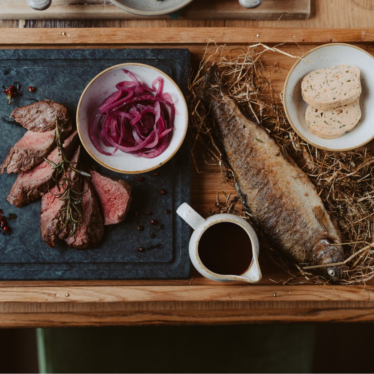 We feast on the hunter's board for two with venison pâté, crackling lard, beetroot butter sticks, and first-class smoked eel. For the main course, we savour a tasty pike fillet from the Rügen Bodden and grilled wild boar ribs from the Fläminger Forst. The vegetable side dishes, mountain lentils with yellow savoy cabbage and roasted pointed cabbage with sage potato noodles, are particularly impressive across the board.