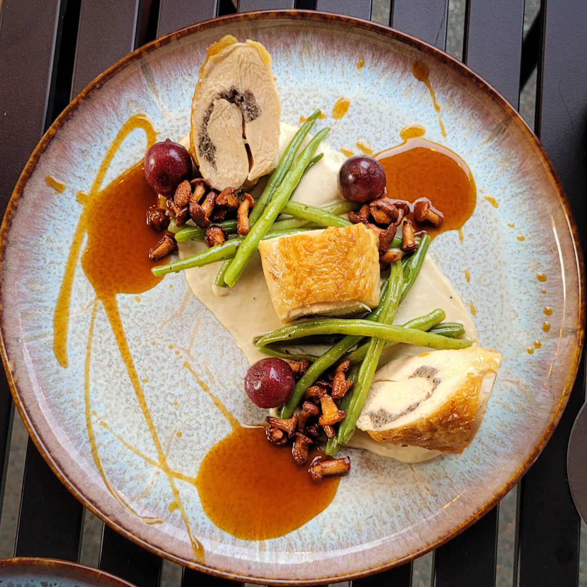 Crispy chips made from kohlrabi leaves garnish my main course: a butter-tender onglet. This part of the beef, which is rather unknown in Germany, comes very close to a fillet when prepared correctly and is served on the edge with kohlrabi, romanesco and veal jus. It is just as delicious as main course two: rolls of corn poulard stuffed with duxelles, usually more familiar from beef Wellington, served with a summery side dish of chanterelles, gooseberries and green beans.