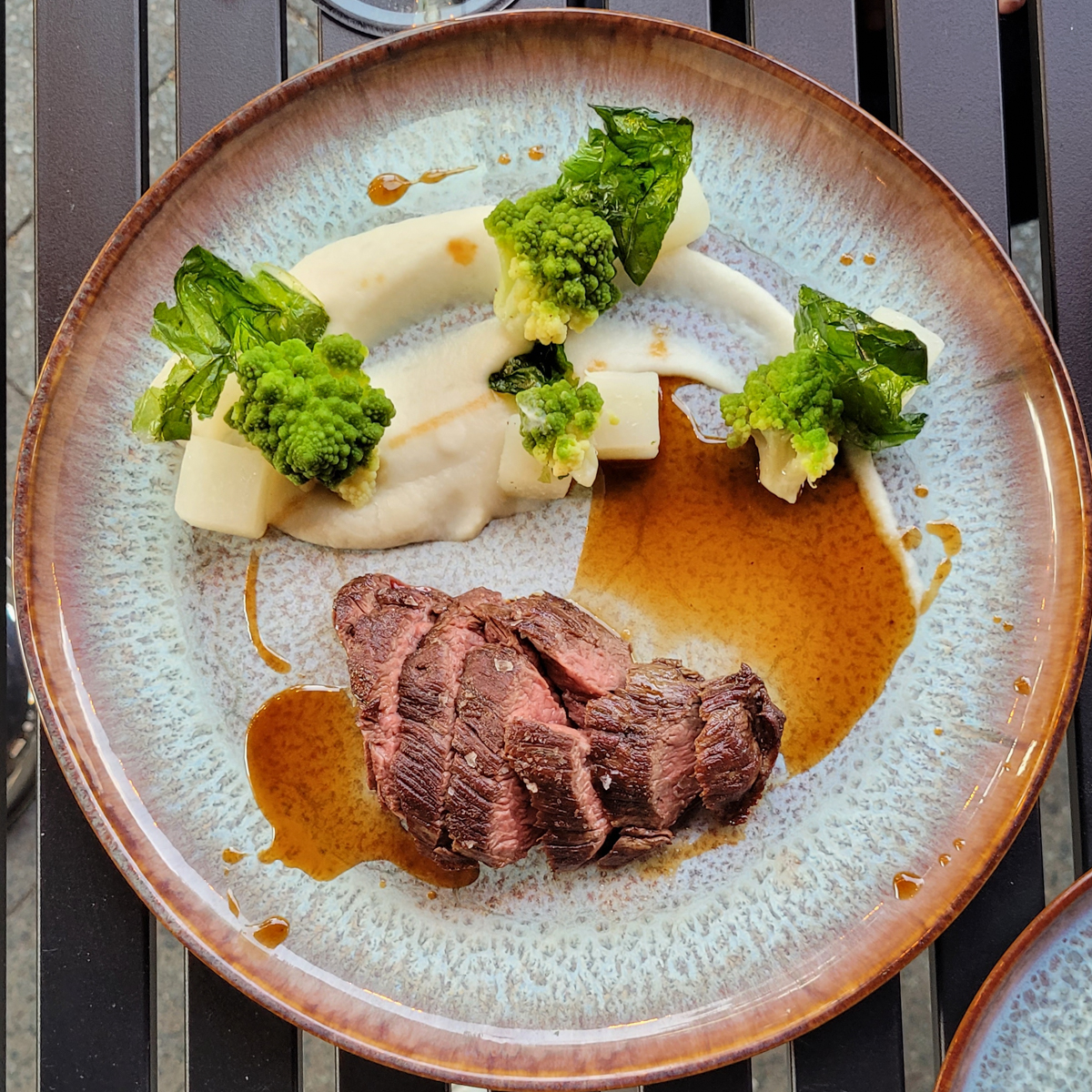 During our visit, however, we try out the regular menu. On the terrace, we feel like we are at the heart of Kreuzberg. We watch the passers-by on Skalitzer, and the iconic yellow BVG trains - you can't get more Berlin than that. While we sip our Crémant, a lovingly crafted greeting comes from the kitchen. Panipuri, a classic snack from India, a crispy ball filled with apple, beetroot, crème fraiche, fried oyster mushrooms and shiso cress, topped with a bit of beetroot dust as a splash of colour. Delicious, pretty and promising.